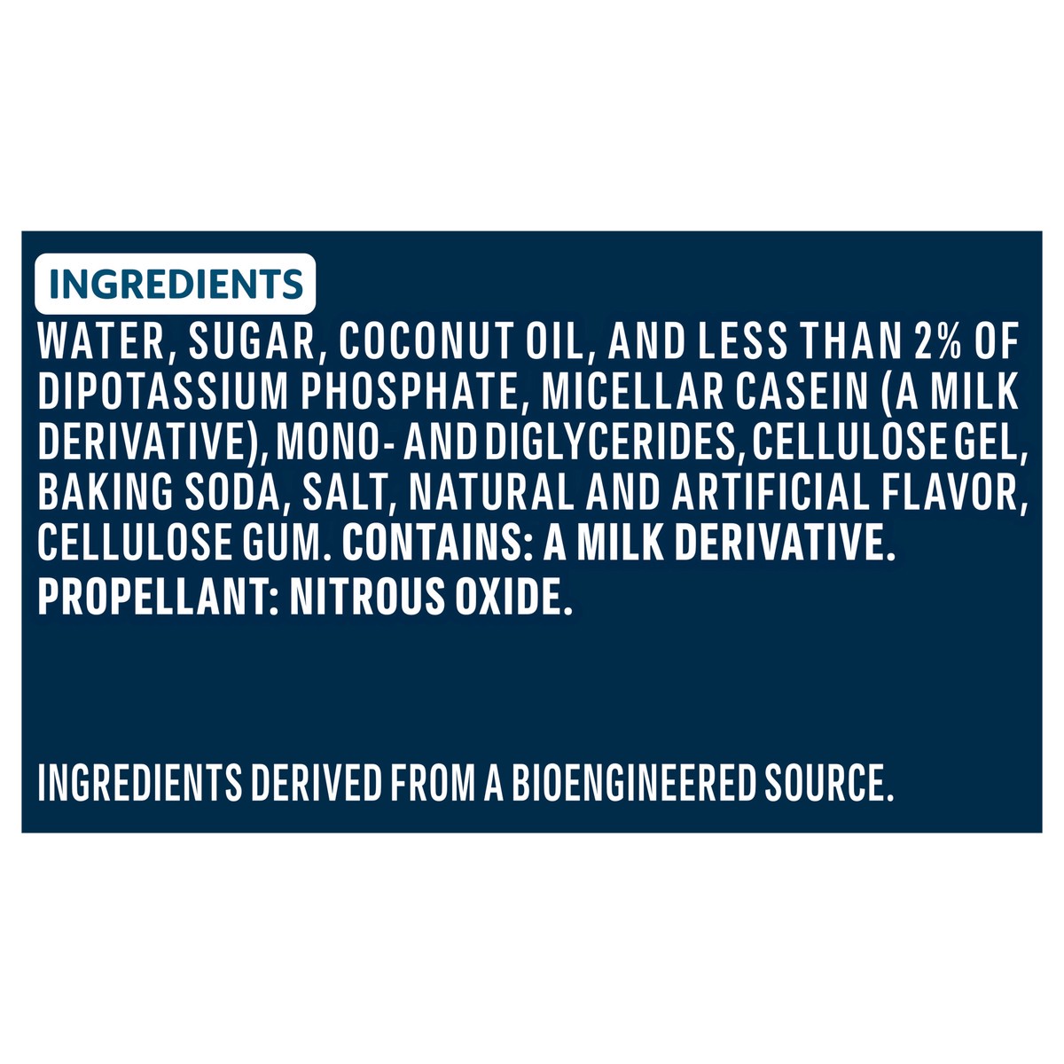 Water, Sugar, Coconut Oil, and Less than 2% of Dipotassium Phosphate, Micellar Casein (a Milk Derivative), Mono- and Diglycerides, Cellulose Gel, Baking Soda, Salt, Natural and Artificial Flavor, Cell…