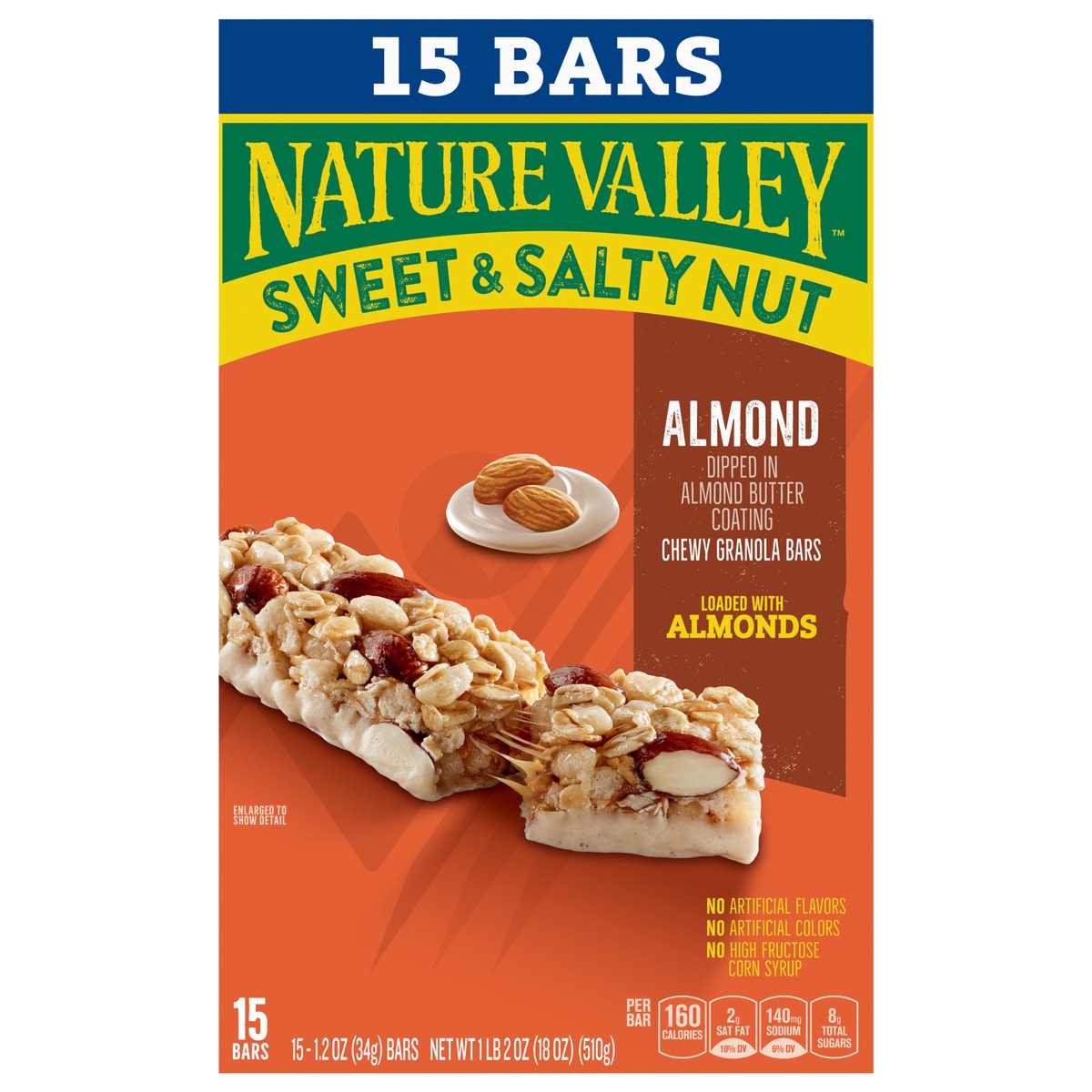 Dipped in almond butter coating bursting with almonds! No artificial flavors. Per Bar: 160 calories; 2 G sat fat (11% DV); 140 mg sodium (6% DV); 8 G total sugars. No artificial colors. No high fructo…