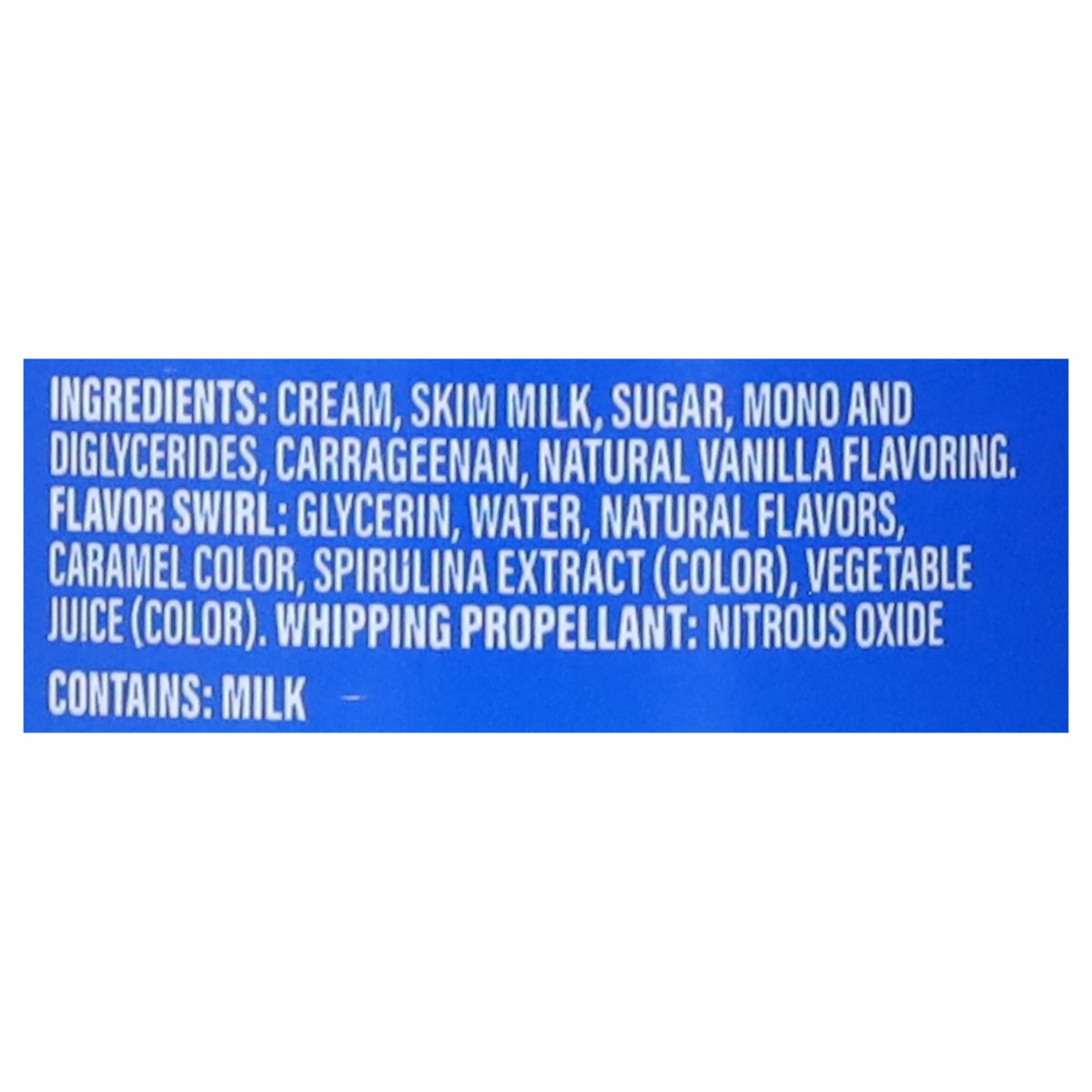 Cream, Skim Milk, Sugar, Mono and Diglycerides, Carrageenan, Natural Vanilla Flavoring, Flavor Swirl: Glycerin, Water, Natural Flavors, Caramel Color, Spirulina Extract (Color), Vegetable Juice (Color…