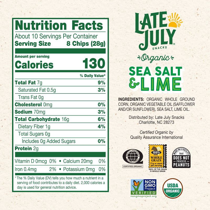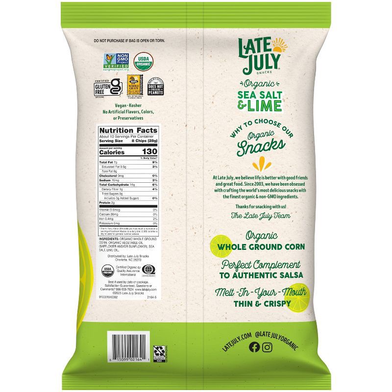 - Includes one (1) 10.1-ounce bag of Late July Sea Salt & Lime Organic Tortilla Chips