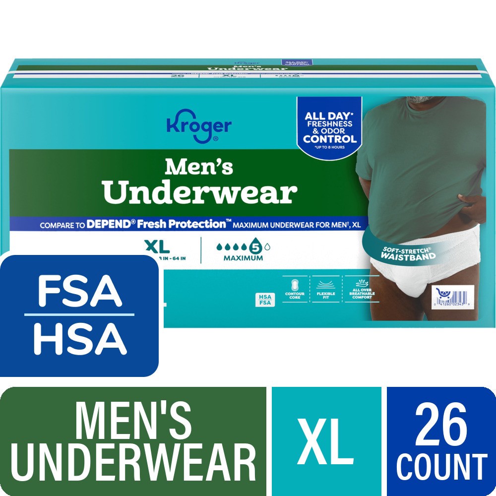 Kroger® Underwear for Men Maximum Absorbency Extra Large ensures all dayˆ freshness and odor control. Crafted for a snug fit with a Soft-Stretch® Waistband, these underwear comfortably fit waists size…