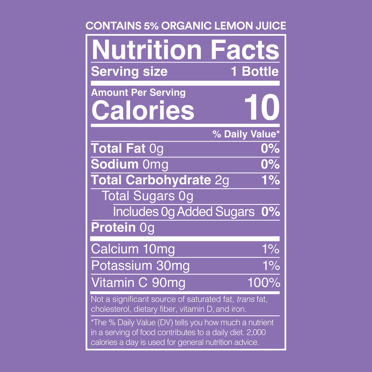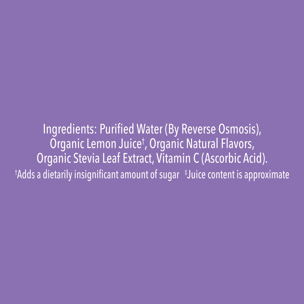 Purified Water (by Reverse Osmosis), Organic Lemon Juice(a), Organic Natural Flavors, Organic Stevia Leaf Extract, Vitamin C (Ascorbic Acid). (a) Adds dietarily insignificant amount of sugar.