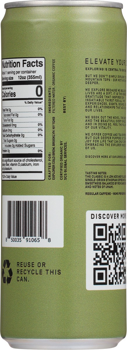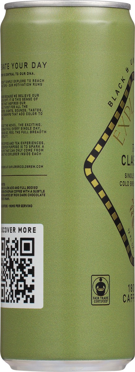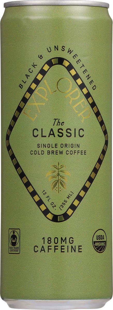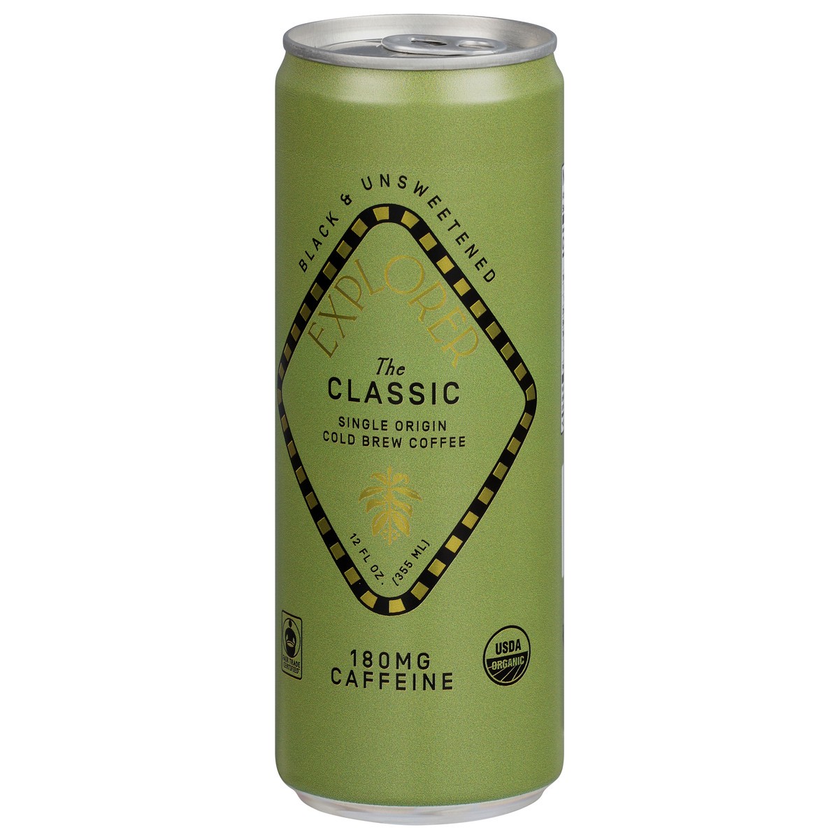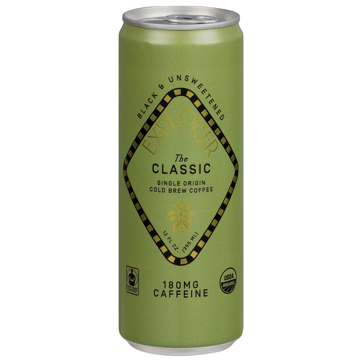 Explorer organic and fair-trade coffee is smooth, bold, and cold brewed to perfection. Perfect for all of your day-to-day caffeination needs. The Classic contains 180 mg of caffeine.
