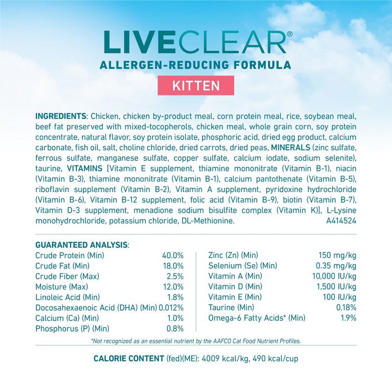 - Real Chicken is the number 1 ingredient in this Purina LiveClear kitten food – your cat will love the taste