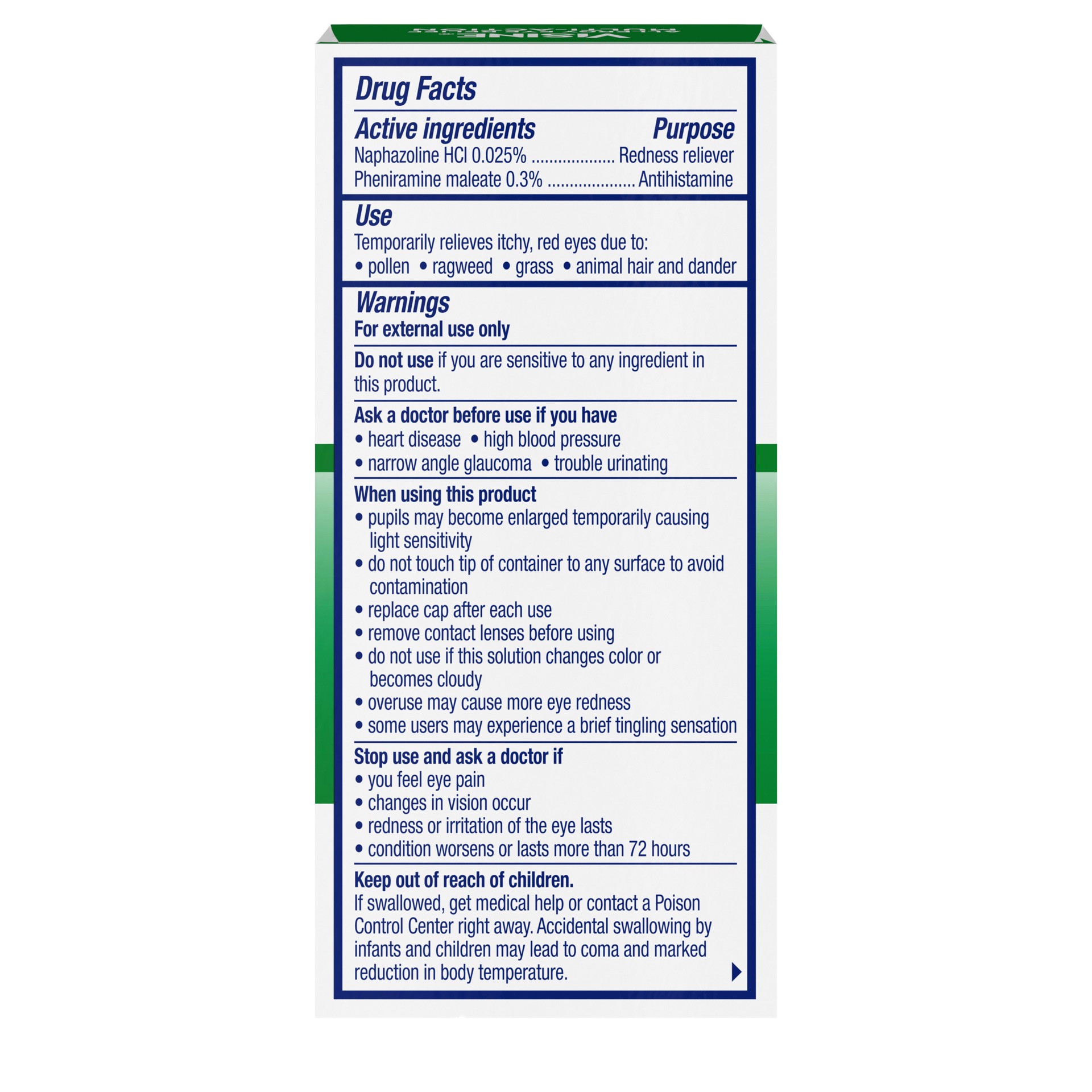 Active Ingredients: Naphazoline HCl 0.025% (Redness Reliever) Pheniramine maleate 0.3% (Antihistamine) Purpose Redness Reliever Antihistamine Inactive ingredients: Benzalkonium chloride, boric acid, e…
