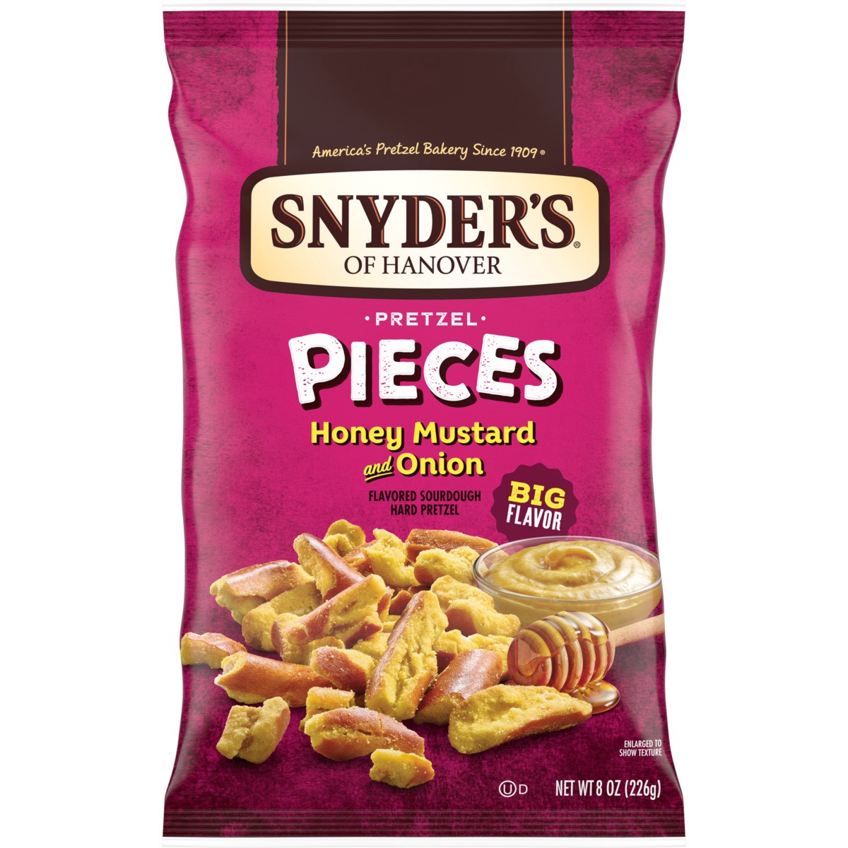 - Includes one (1) 8-ounce bag of Snyder's of Hanover Honey Mustard & Onion Flavored Pretzel Pieces