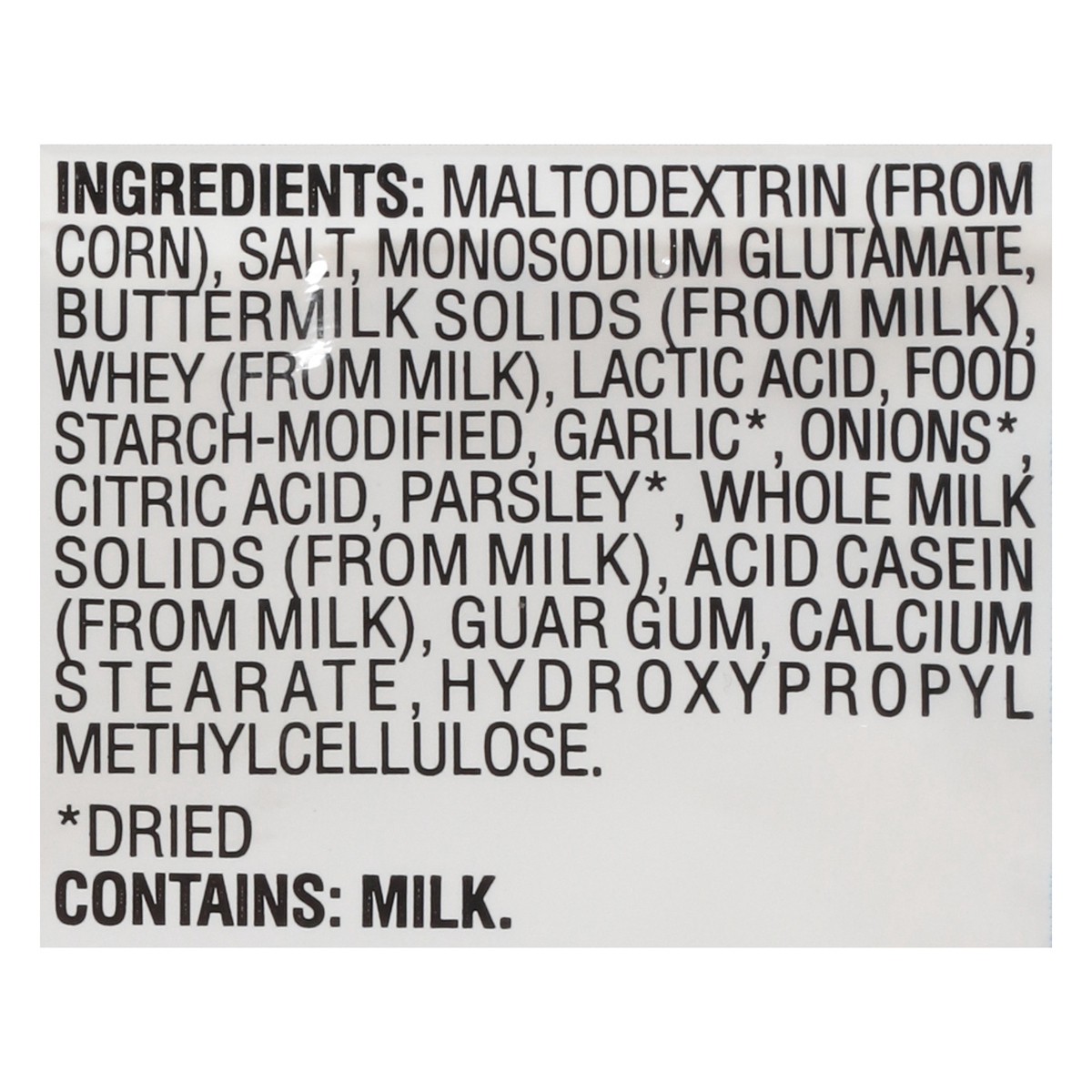 Maltodextrin (from Corn), Salt, Monosodium Glutamate, Buttermilk Solids (from Milk), Whey (from Milk), Lactic Acid, Food Starch-Modified, Garlic (Dried), Onions (Dried), Citric Acid, Parsley (Dried), …