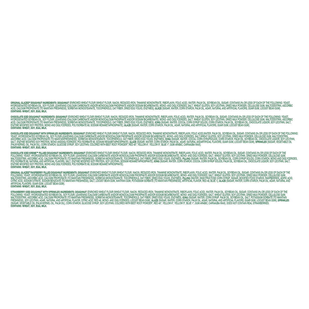 Original Glazed: Doughnut (Enriched Wheat Flour (Wheat Flour, Niacin, Reduced Iron, Thiamine Mononitrate, Riboflavin, Folic Acid), Water, Palm Oil, Soybean Oil, Sugar, Contains 2% or Less of Each of t…