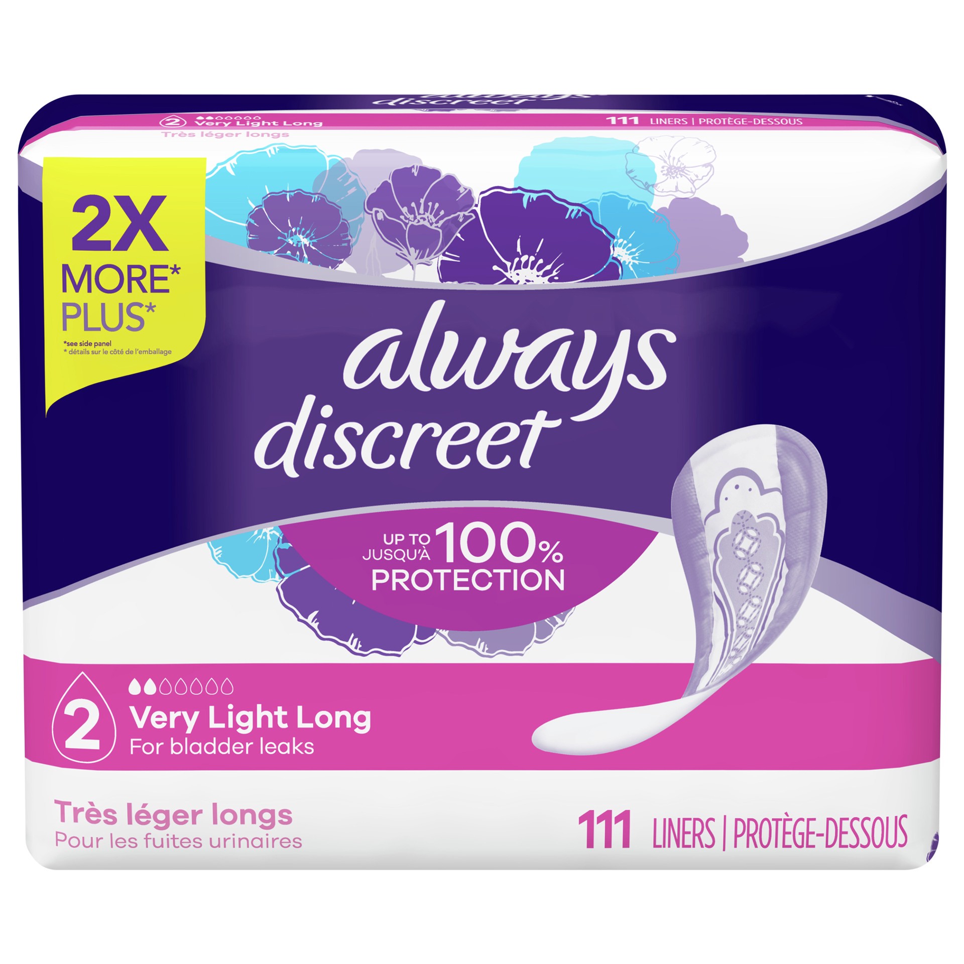 2x more (vs. next smallest Always Discreet pack). Up to 100% protection. For bladder leaks. Ideal for day or night. Lightly scented. FSA: Call your healthcare provider for details.
