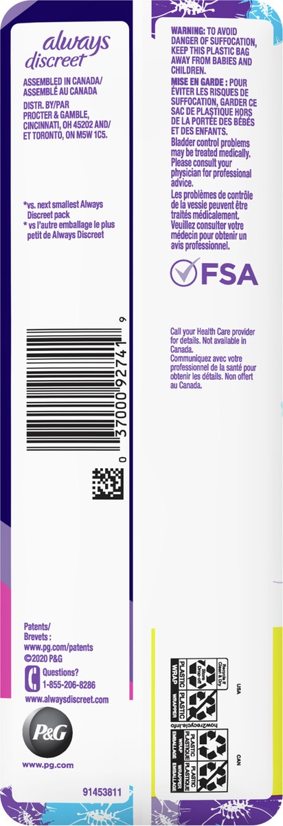 2x more (vs. next smallest Always Discreet pack). Up to 100% protection. For bladder leaks. Ideal for day or night. Lightly scented. FSA: Call your healthcare provider for details.