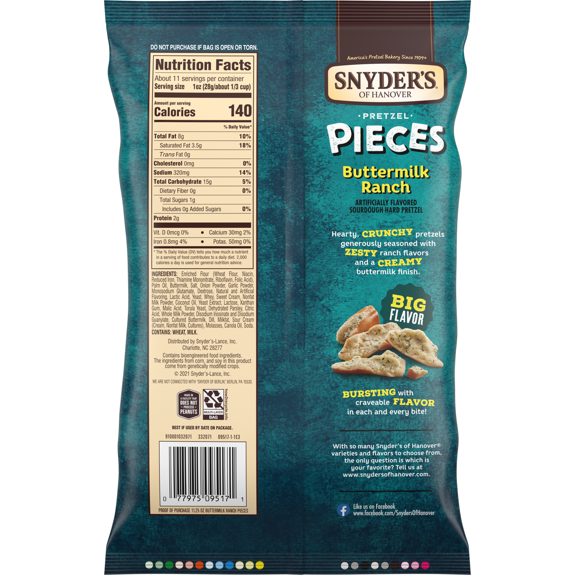- Includes one (1) 11.25-ounce bag of Snyder's of Hanover Buttermilk Ranch Flavored Pretzel Pieces