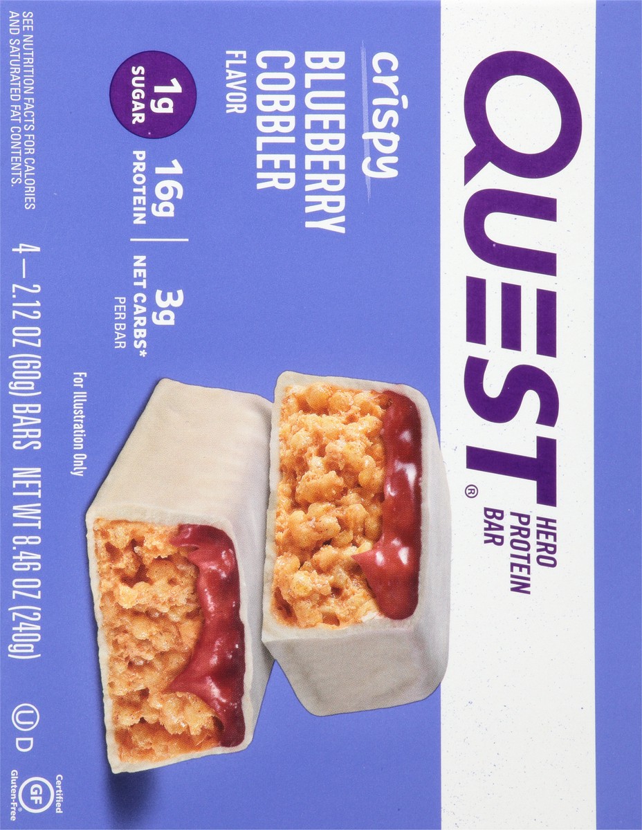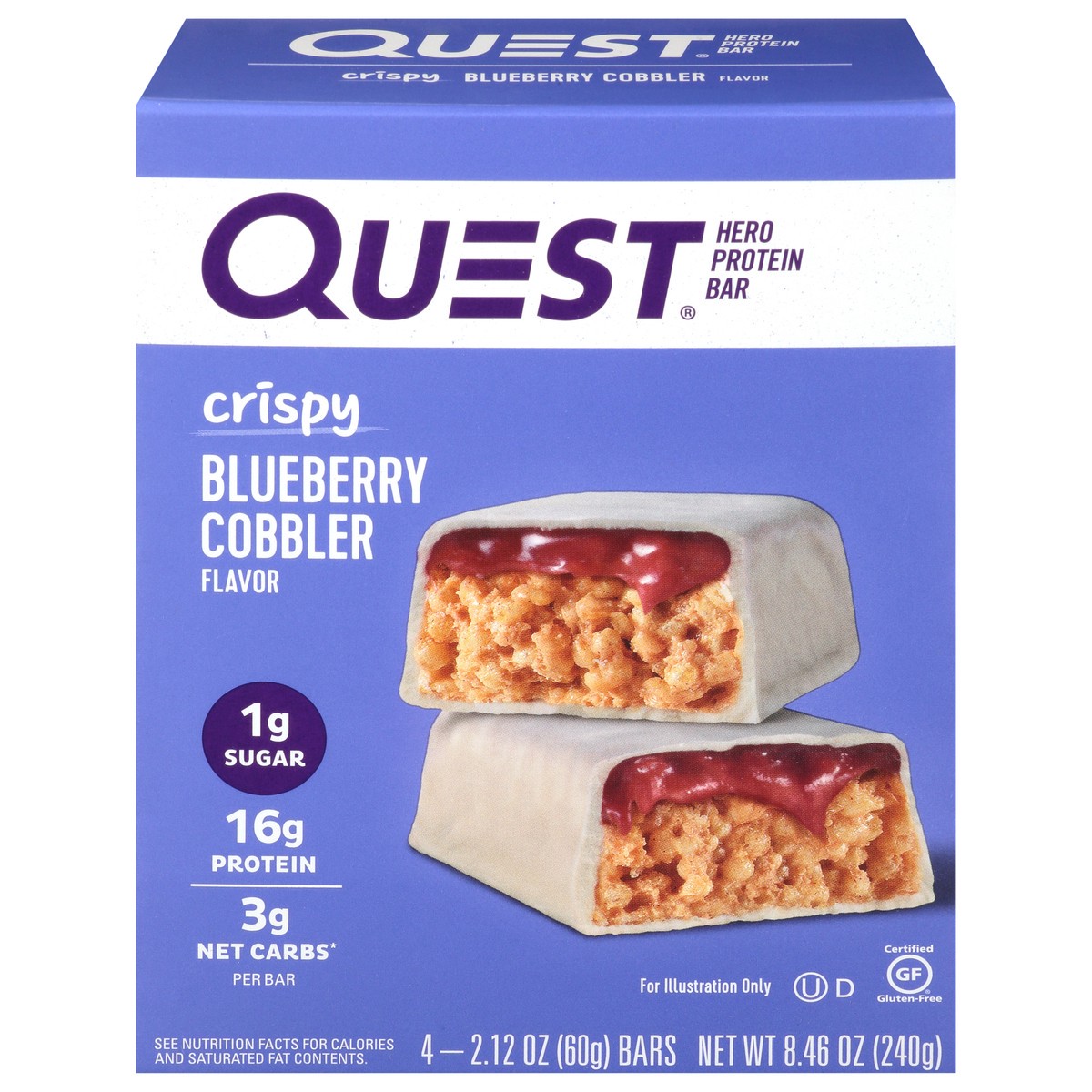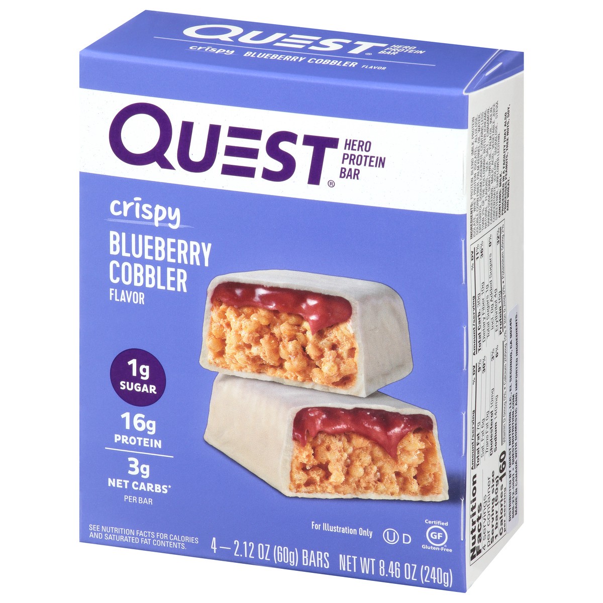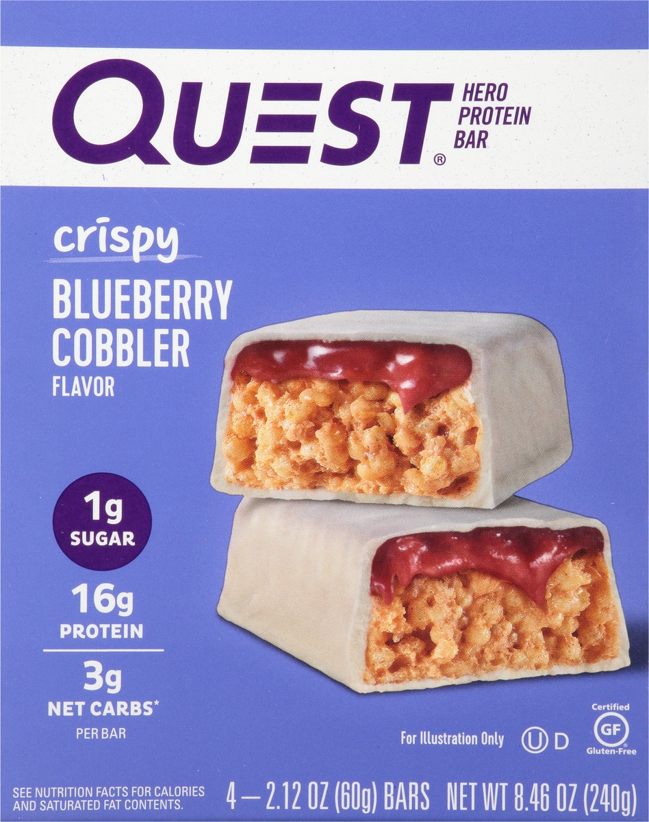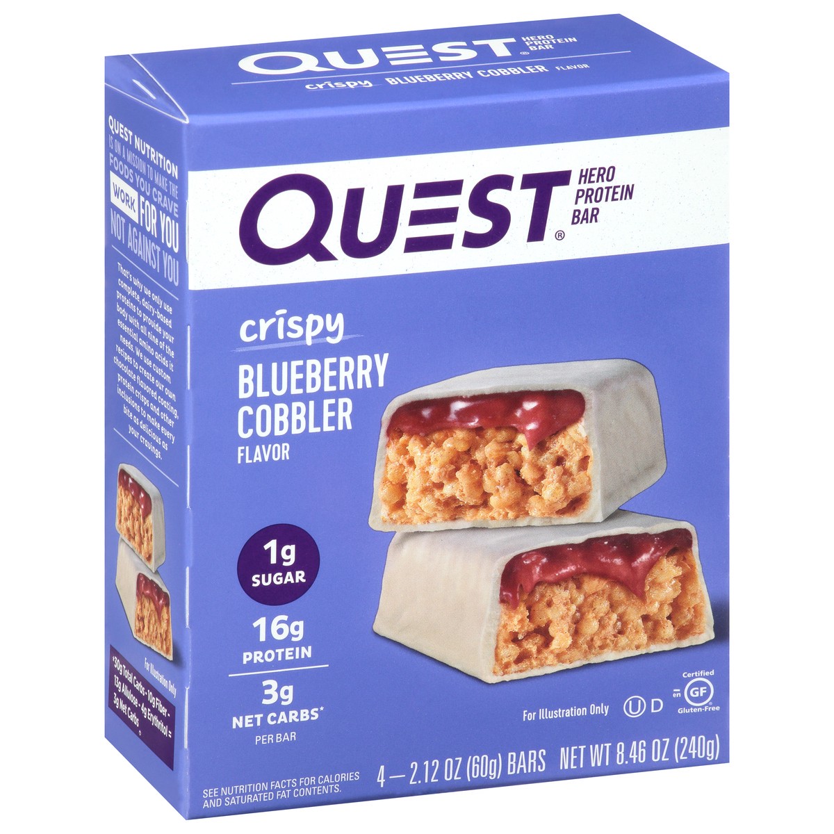 - YOU DESERVE A SWEET TREAT: The Quest Crispy Blueberry Cobbler Hero Protein Bar tastes like an oven-baked cobbler. Only our version has 17g protein, 3g net carbs and 1g of sugar.