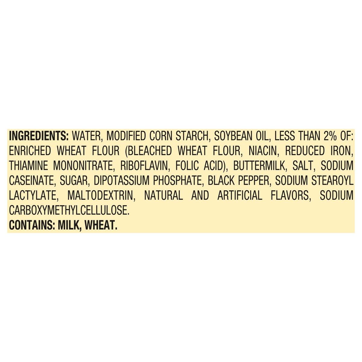 Water, Modified Corn Starch, Soybean Oil, Less than 2% of: Enriched Wheat Flour (Bleached Wheat Flour, Niacin, Reduced Iron, Thiamine Mononitrate, Riboflavin, Folic Acid), Buttermilk, Salt, Sodium Cas…