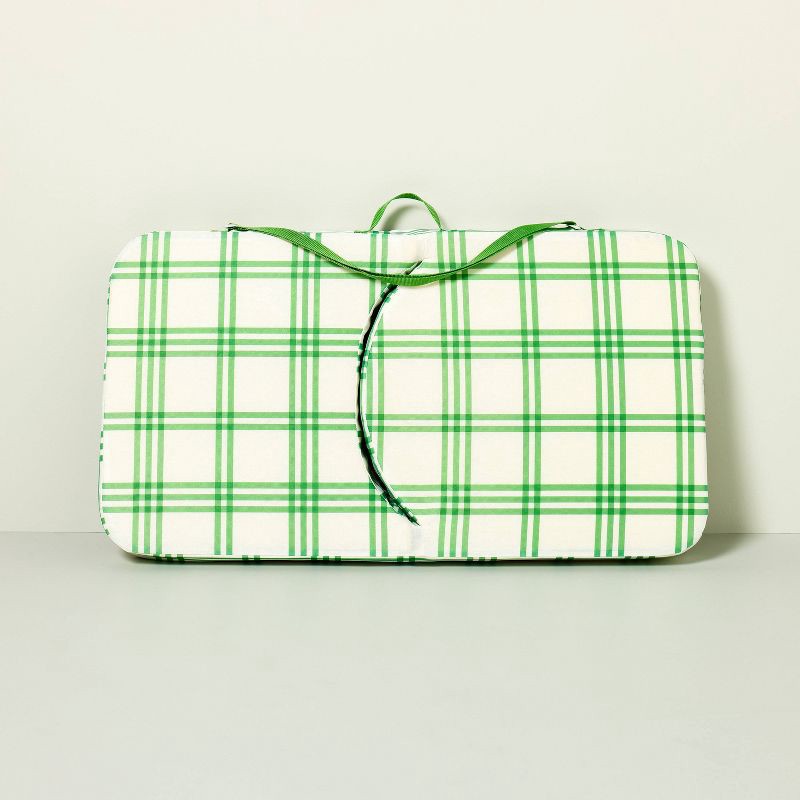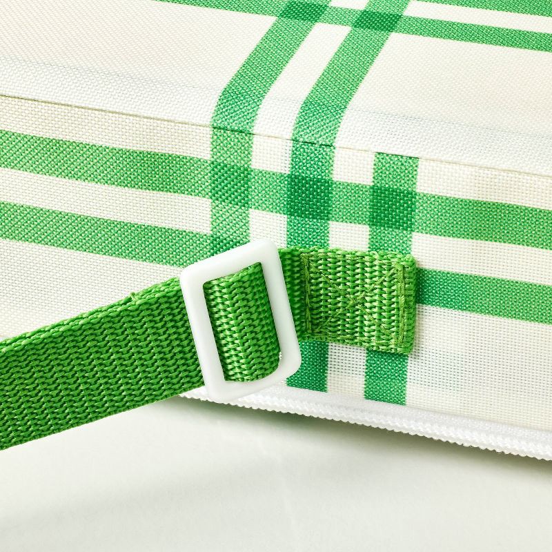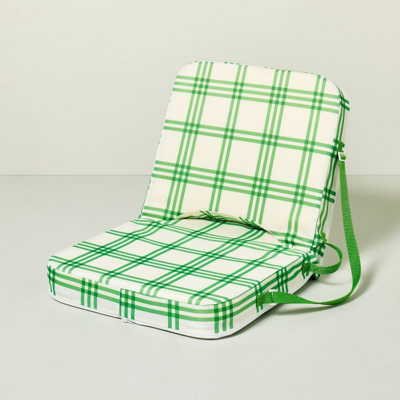 Sit comfortably at the big game with the Tri-Stripe Plaid Adjustable Stadium Seat from Hearth & Hand™ with Magnolia. This green and cream stadium seat is covered with a plaid pattern with triple strip…