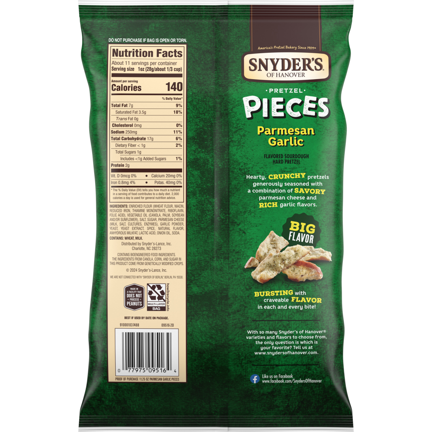 - Includes one (1) 11.25-ounce bag of Snyder''s of Hanover Parmesan Garlic Flavored Pretzel Pieces