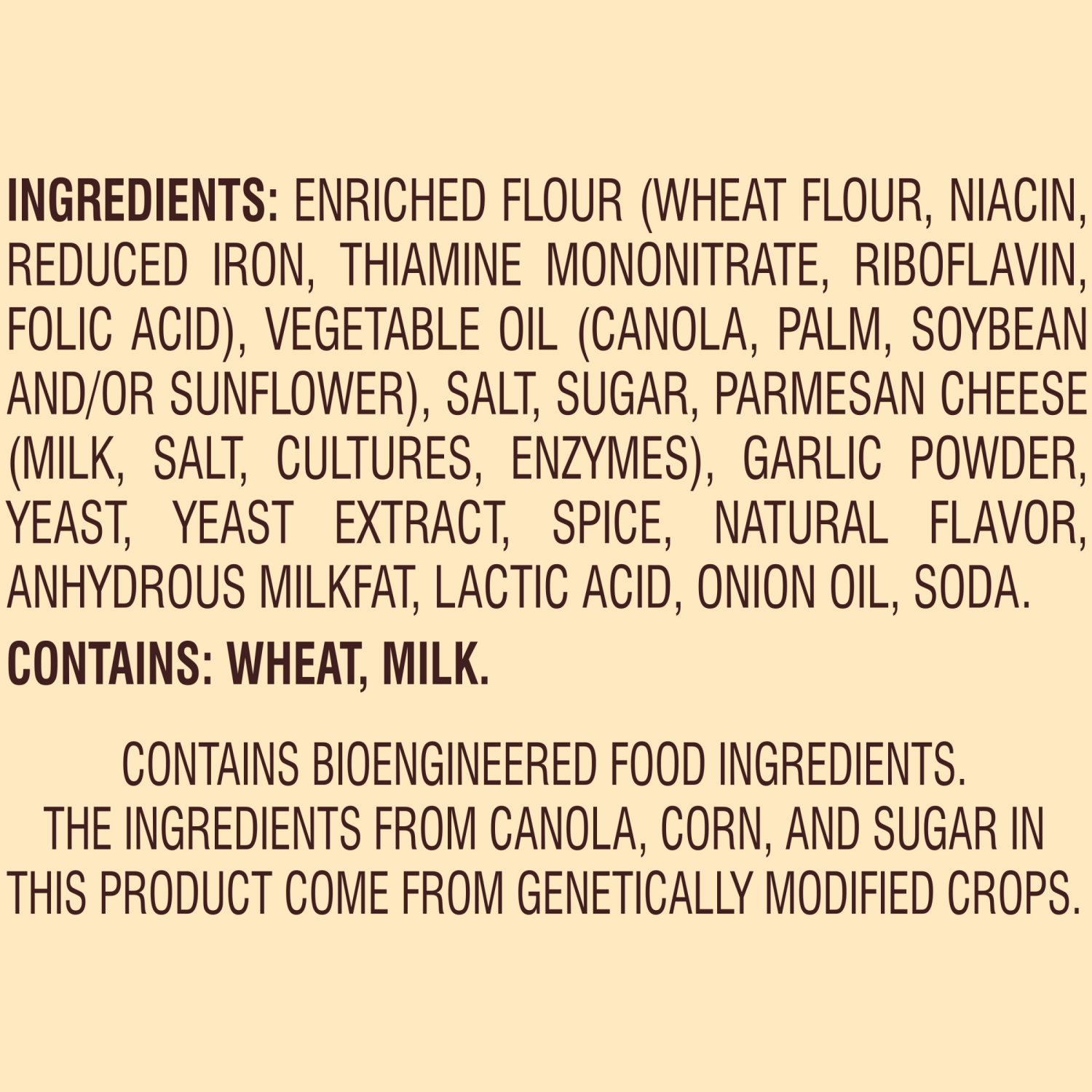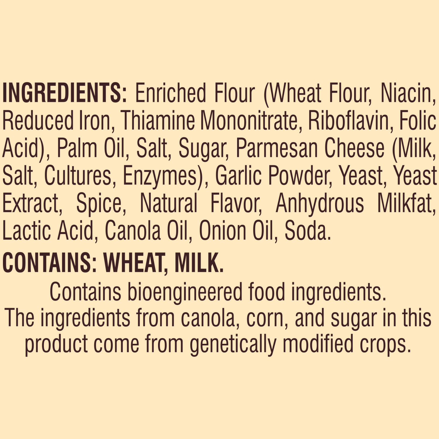 INGREDIENTS: ENRICHED FLOUR (WHEAT FLOUR, NIACIN, REDUCED IRON, THIAMINE MONONITRATE, RIBOFLAVIN, FOLIC ACID), VEGETABLE OIL (CANOLA, PALM, SOYBEAN AND/OR SUNFLOWER), SALT, SUGAR, PARMESAN CHEESE (MIL…