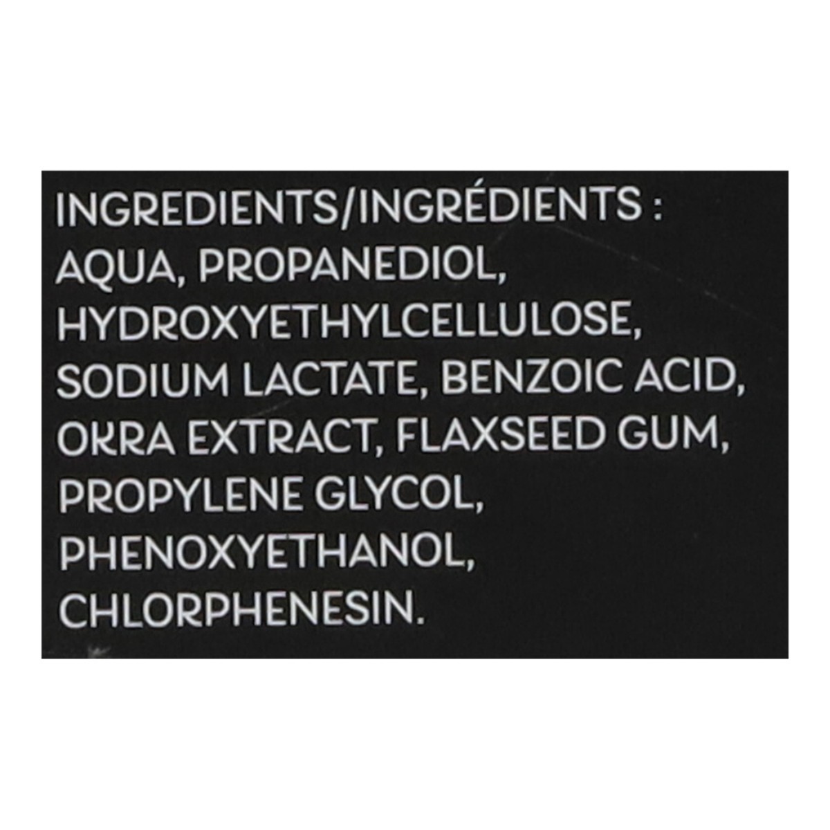 Aqua, Propanediol, Hydroxyethylcellulose, Sodium Lactate, Benzoic Acid, Okra Extract, Flaxseed Gum, Propylene Glycol, Phenoxyethanol, Chlorphenesin.