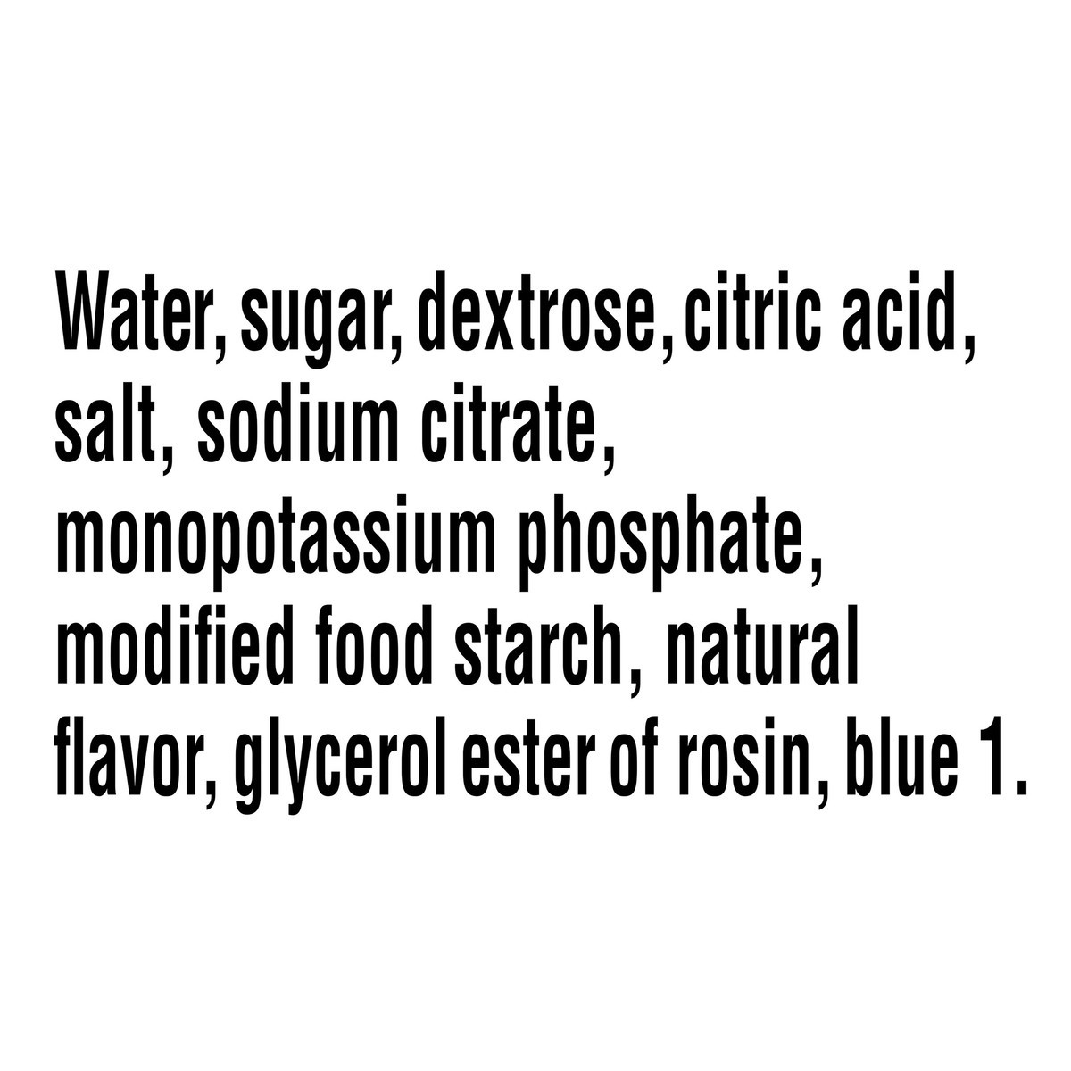 Water, Sugar, Dextrose, Citric Acid, Salt, Sodium Citrate, Monopotassium Phosphate, Modified Food Starch, Natural Flavor, Glycerol Ester Of Rosin, Blue 1.