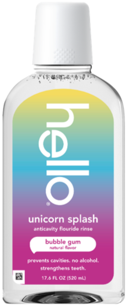 Includes one 17.6 fl oz bottle of hello® Unicorn Splash Fluoride Kids Mouthwash, Alcohol Free* Bubble Gum Flavored Mouthwash The bubble gum mouthwash tastes magical and works brilliantly to fight cavi…