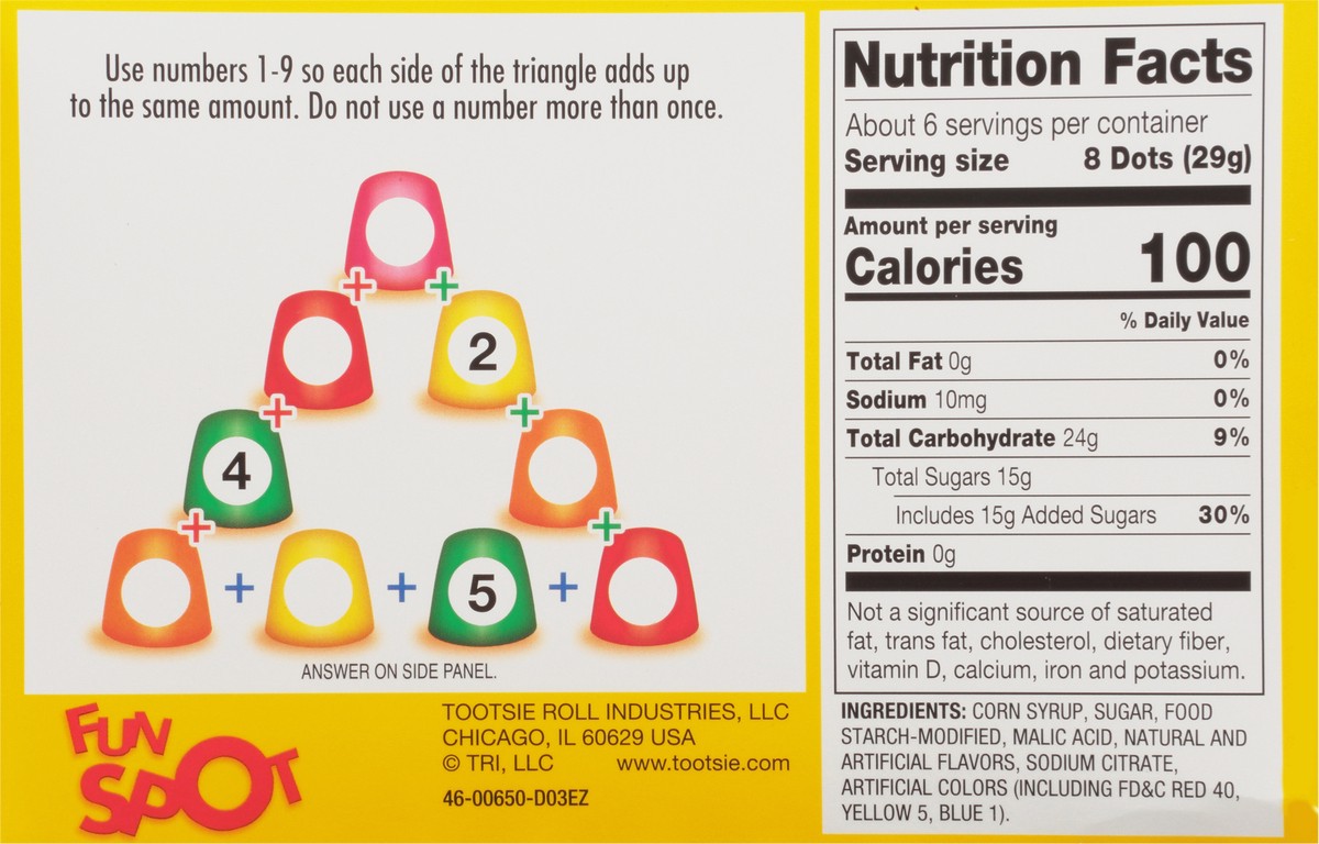 Min. 47 pieces. Product sold by weight not volume. Contents tend to settle after packaging. Get to the dots. Fun spot. Start. Goal. Answer on side panel.