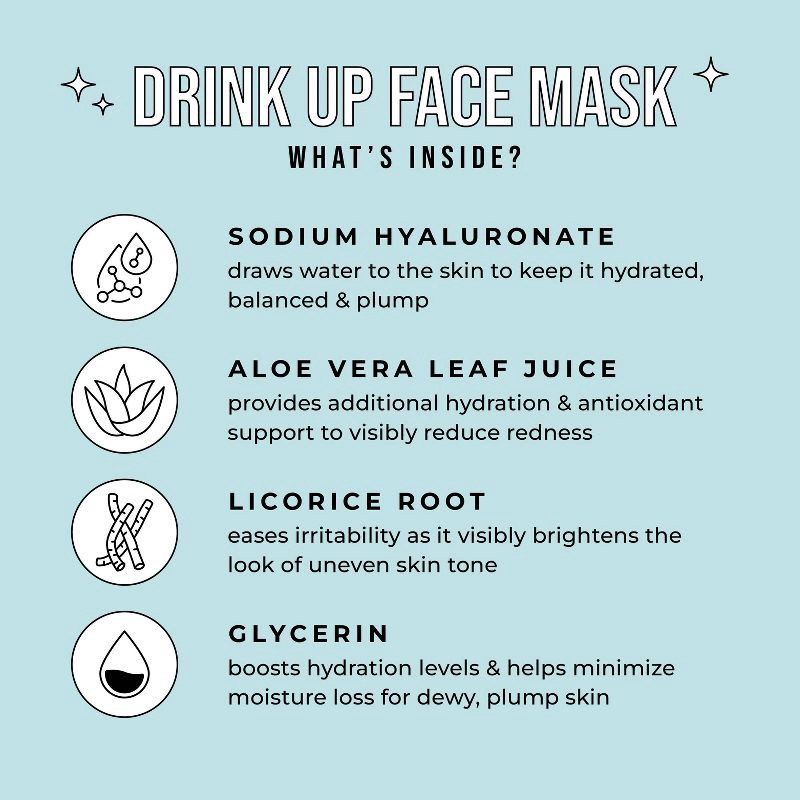 Drink Up Face Mask is for dry skin helps restore and preserve hydration. Use this sheet mask to deep condition, rejuvenate dry skin and keep skin soft and glowing. It's like a tall glass of water for …
