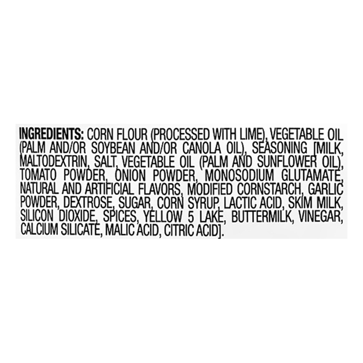 Corn Flour (Processed With Lime), Vegetable Oil (Palm And/Or Soybean And/Or Canola Oil), Seasoning [Milk, Maltodextrin, Salt, Vegetable Oil (Palm And Sunflower Oil), Tomato Powder, Onion Powder, Monos…