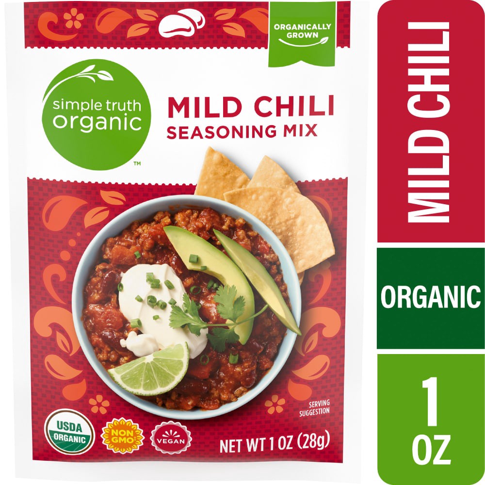 Simple Truth Organic® Mild Chili Seasoning Mix Pouch stirs up magic in your meals! Boasting USDA organic and non-GMO quality, this blend showcases rich cumin, smoky paprika, and a touch of fiery cayen…