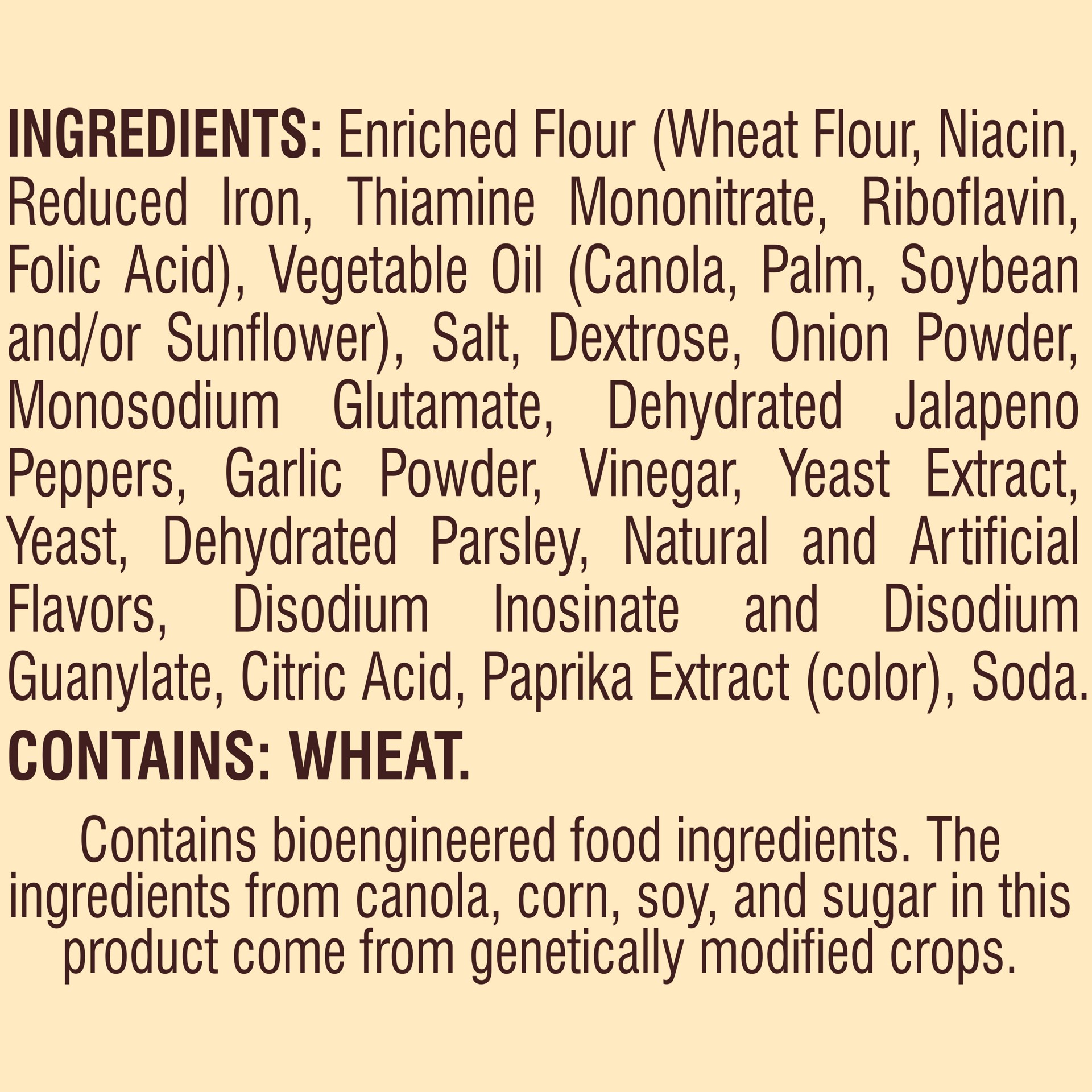 INGREDIENTS: ENRICHED FLOUR (WHEAT FLOUR, NIACIN, REDUCED IRON, THIAMINE MONONITRATE, RIBOFLAVIN, FOLIC ACID), VEGETABLE OIL (CANOLA, PALM, SOYBEAN AND/OR SUNFLOWER), SALT, DEXTROSE, ONION POWDER, MON…