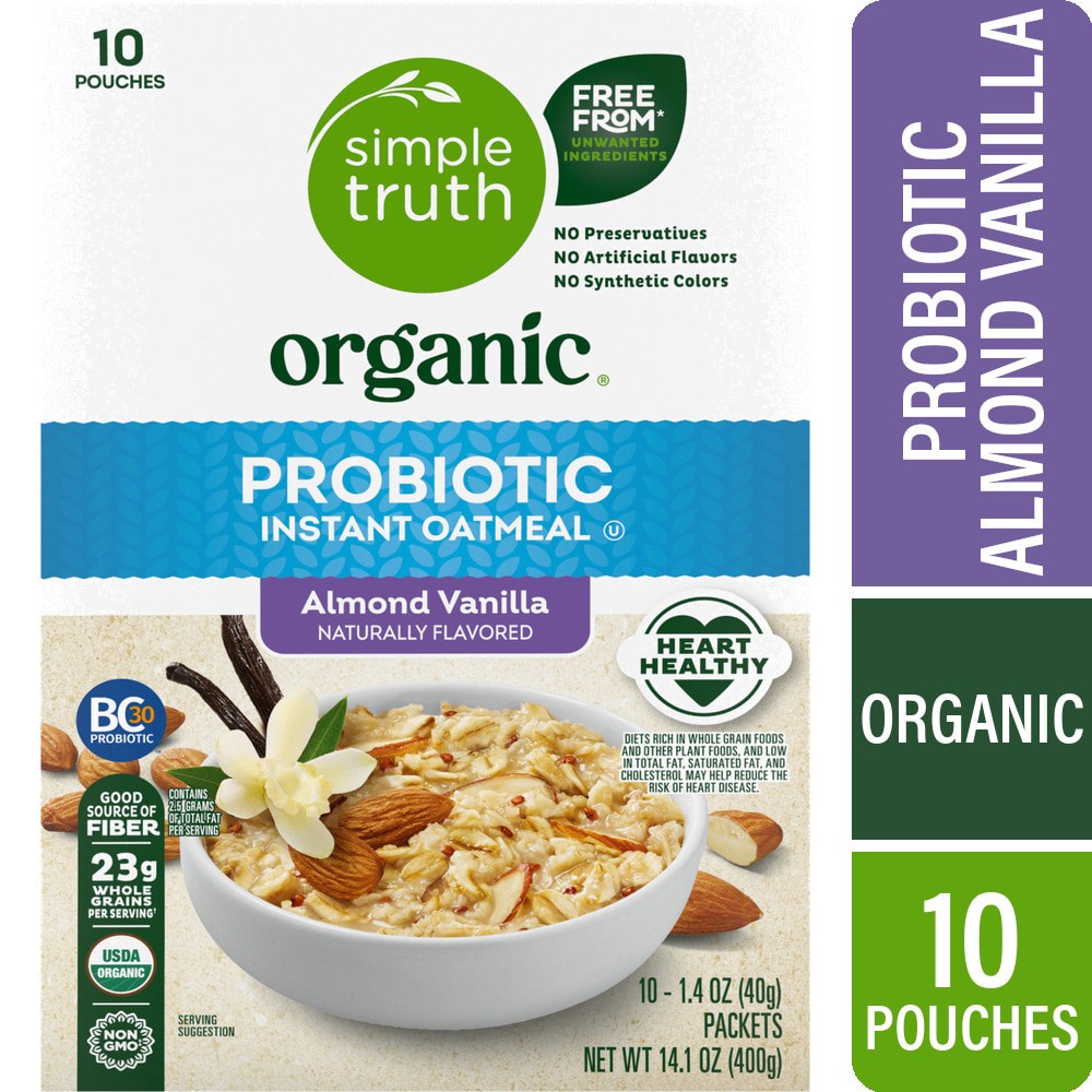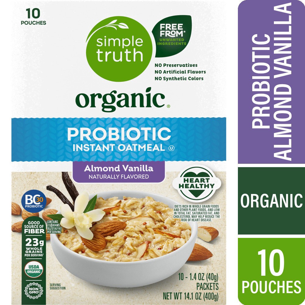 Simple Truth Organic® Probiotic Almond Vanilla Instant Oatmeal bowls over taste buds with flavor you're sure to love! Delicious, organic whole grain oats are enriched with crunchy organic almonds, and…
