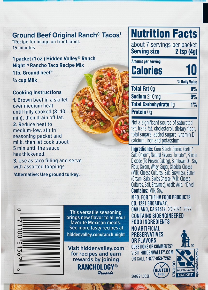 - DELICIOUS SEASONING MIX: One 1-oz. packet of Hidden Valley Rancho Taco Recipe Mix to transform your favorite Mexican dishes