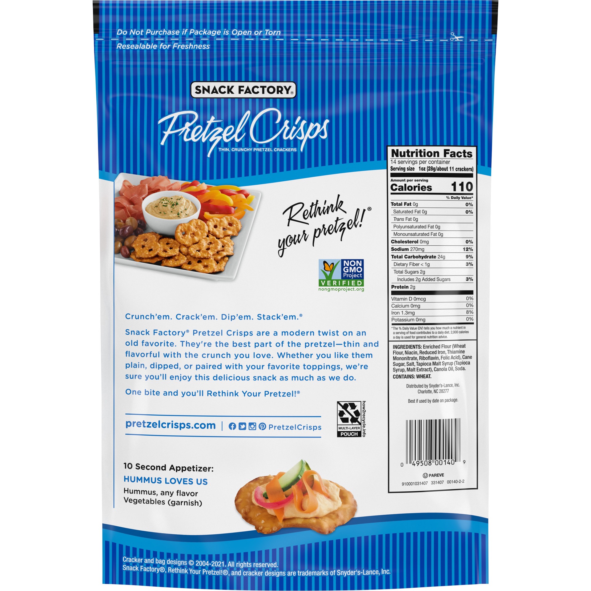 Dip or no dip, Snack Factory Original Pretzel Crisps are flat-out delicious. A modern, gourmet twist on an old favorite, these thin and crunchy pretzel chips give you the best part of traditional pret…