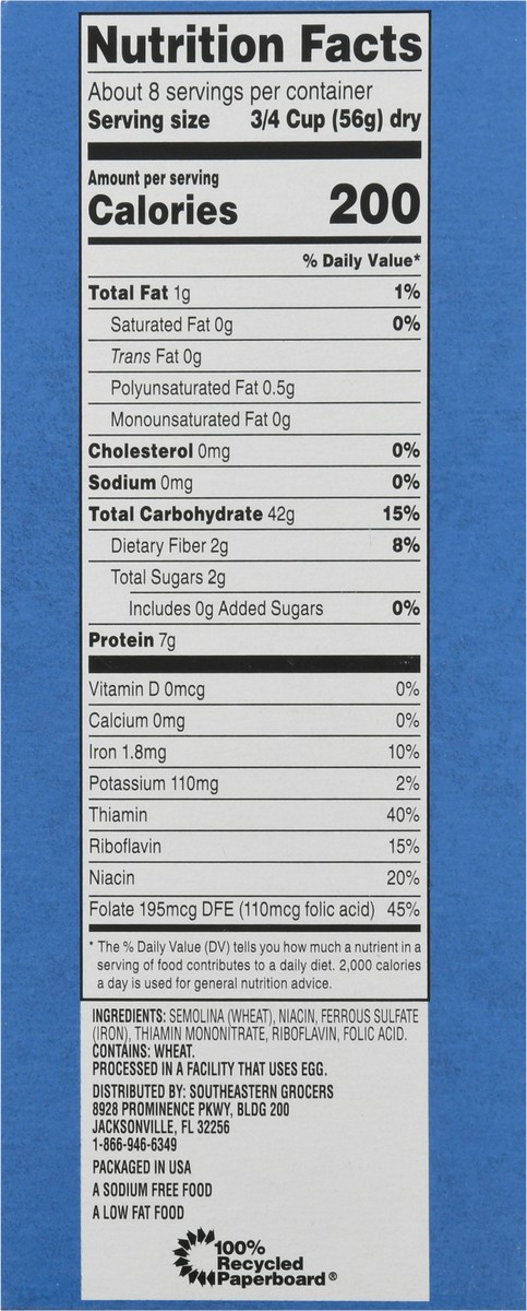Semolina (Wheat), Niacin, Ferrous Sulfate (Iron), Thiamin Mononitrate, Riboflavin, Folic Acid.
