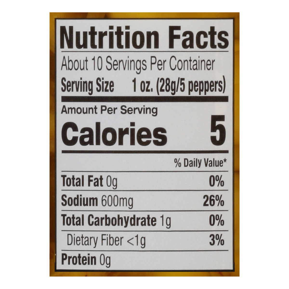 Pepperoncini, Water, Vinegar, Salt, Acetic Acid, Citric Acid, Sodium Benzoate (Preservative), Sodium Metabisulfite (Color Retention), Yellow 5.