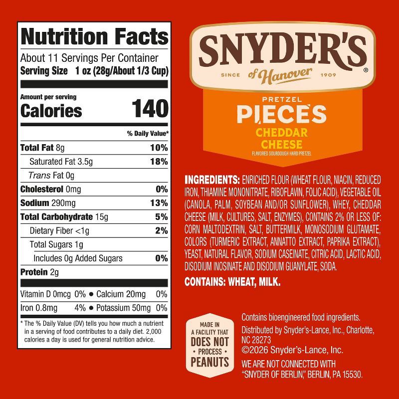 - Includes one (1) 11.25-ounce bag of Snyder's of Hanover Cheddar Cheese Flavored Pretzel Pieces