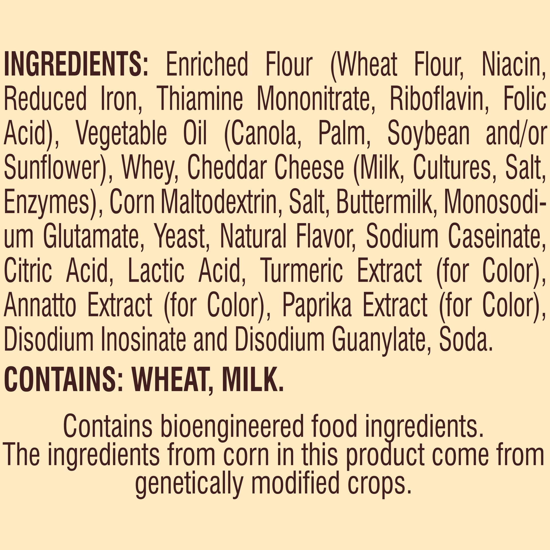 INGREDIENTS: ENRICHED FLOUR (WHEAT FLOUR, NIACIN, REDUCED IRON, THIAMINE MONONITRATE, RIBOFLAVIN, FOLIC ACID), VEGETABLE OIL (CANOLA, PALM, SOYBEAN AND/OR SUNFLOWER), WHEY, CHEDDAR CHEESE (MILK, CULTU…