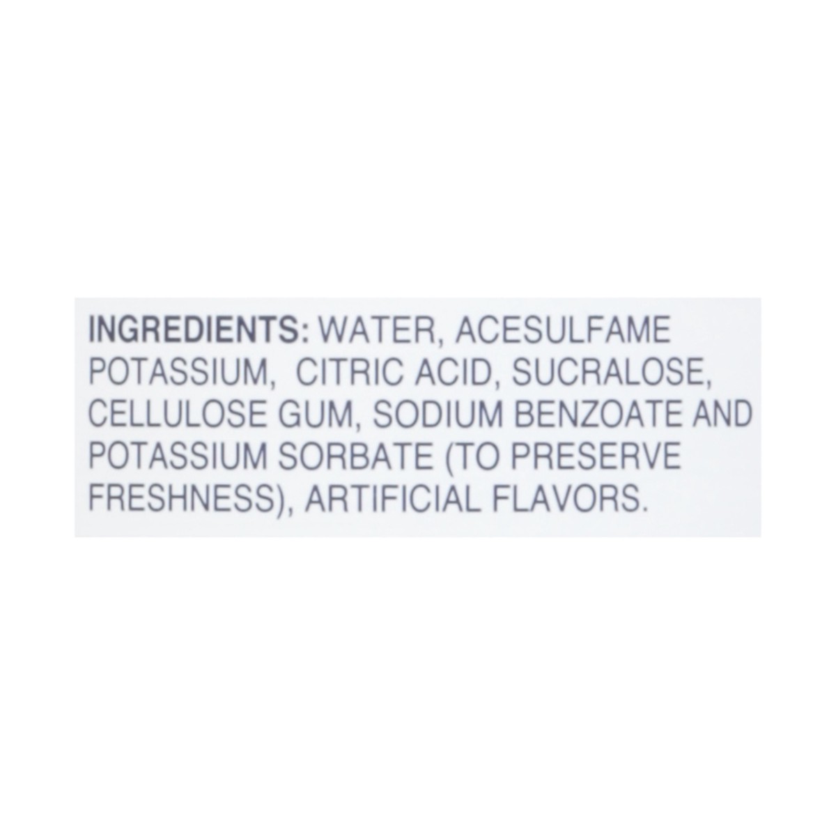 Water, Acesulfame Potassium, Citric Acid, Sucralose, Cellulose Gum, Sodium Benzoate and Potassium Sorbate (to Preserve Freshness), Artificial Flavors.