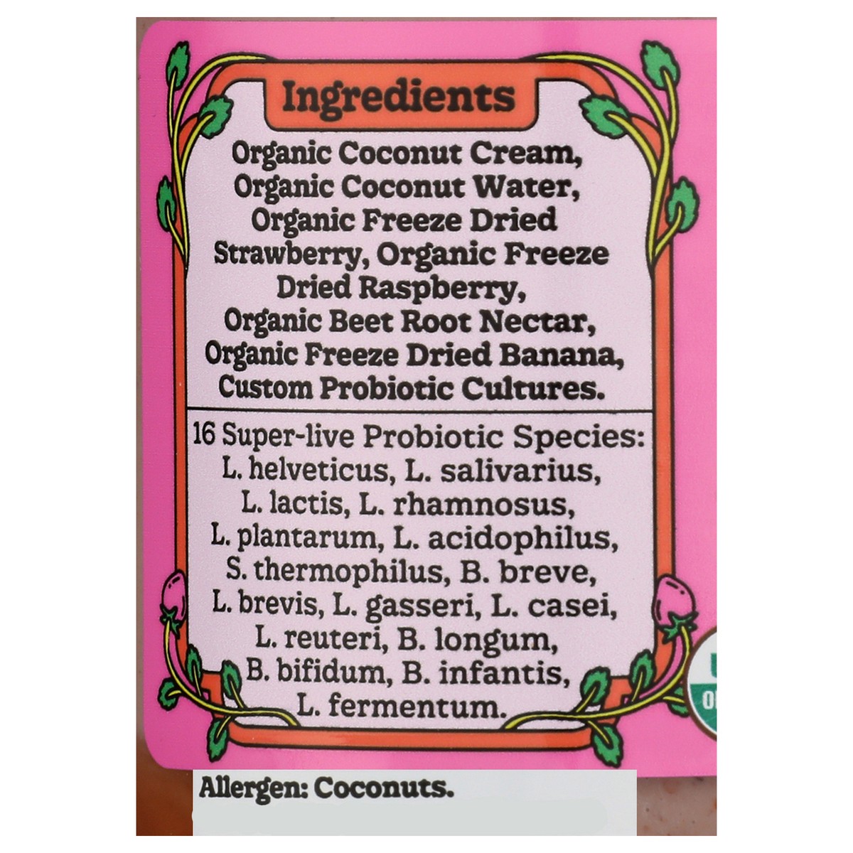 Organic Coconut Cream, Organic Coconut Water, Organic Freeze Dried Strawberry, Organic Freeze Dried Raspberry, Organic Beet Root Nectar, Organic Freeze Dried Banana, Custom Probiotic Cultures. 16 Supe…