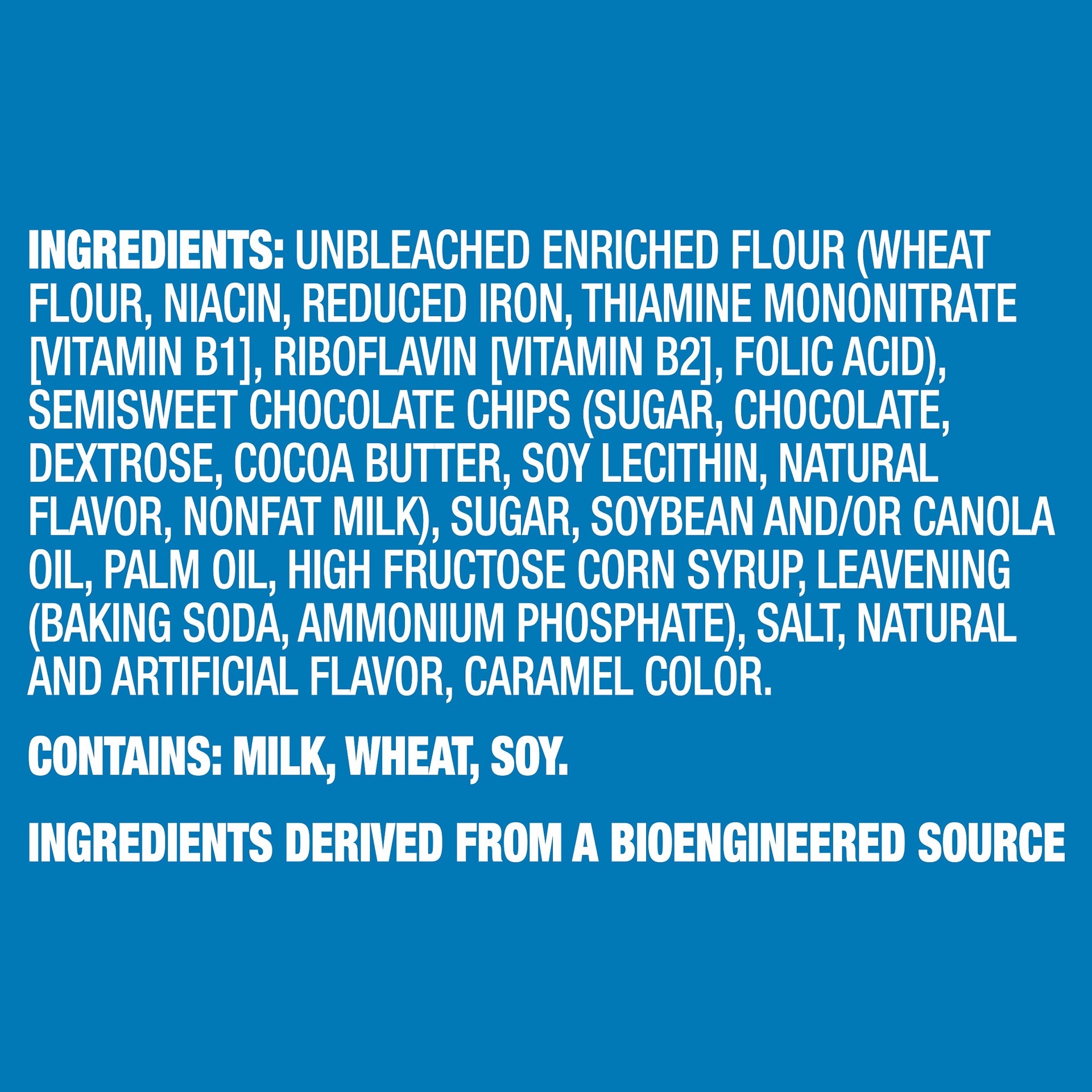 INGREDIENTS: UNBLEACHED ENRICHED FLOUR (WHEAT FLOUR, NIACIN, REDUCED IRON, THIAMINE MONONITRATE [VITAMIN B1], RIBOFLAVIN [VITAMIN B2], FOLIC ACID), SEMISWEET CHOCOLATE CHIPS (SUGAR, CHOCOLATE, DEXTROS…