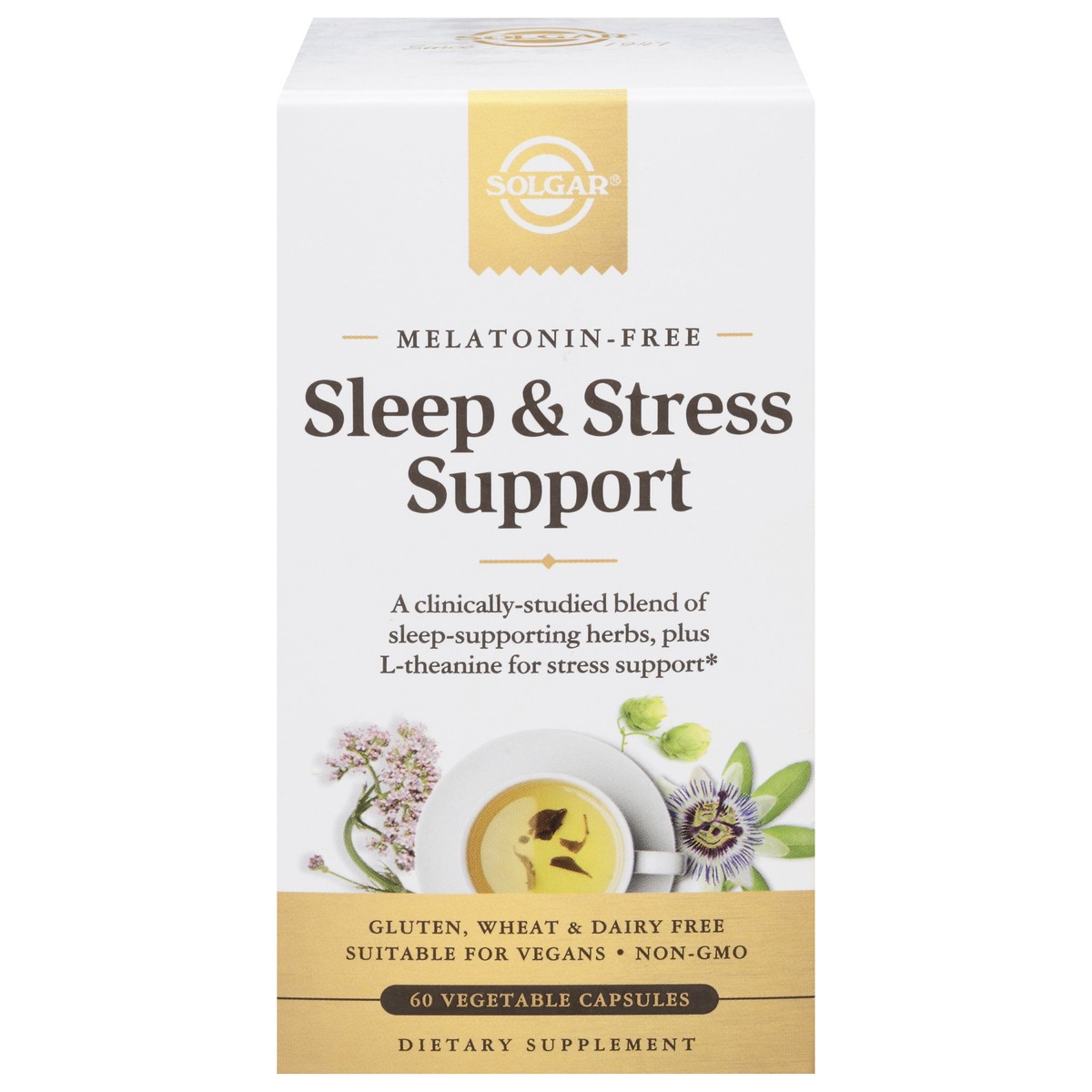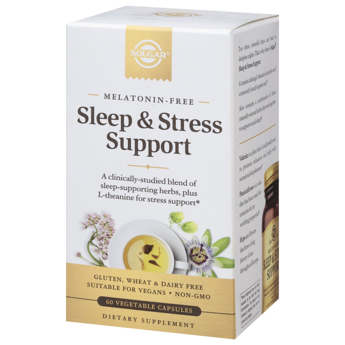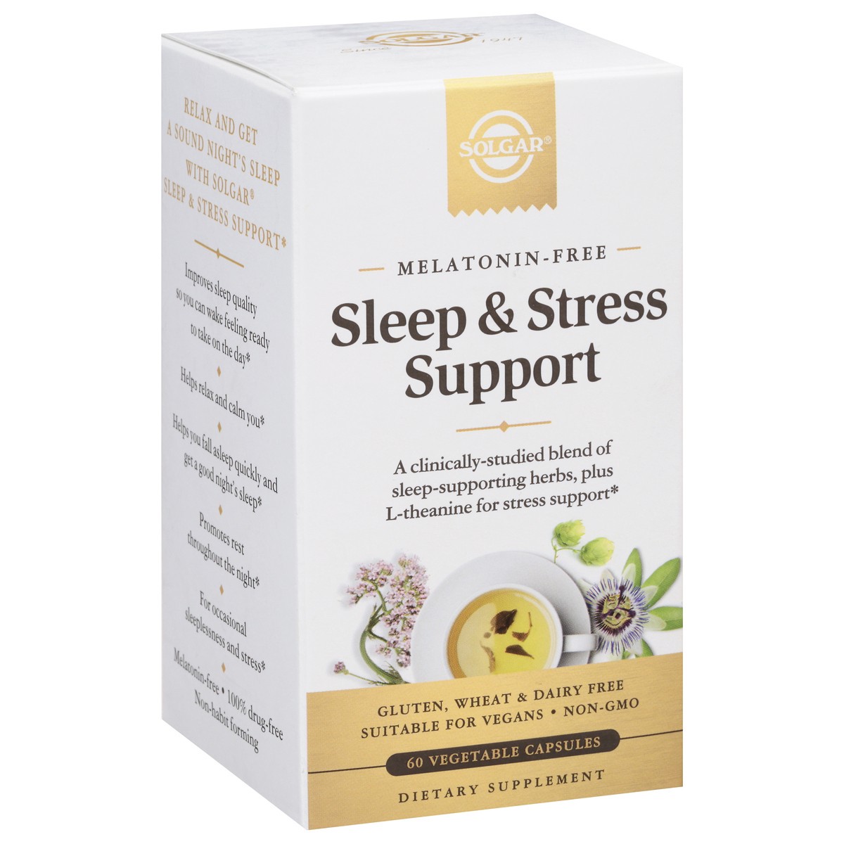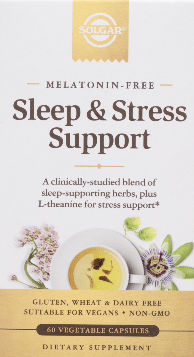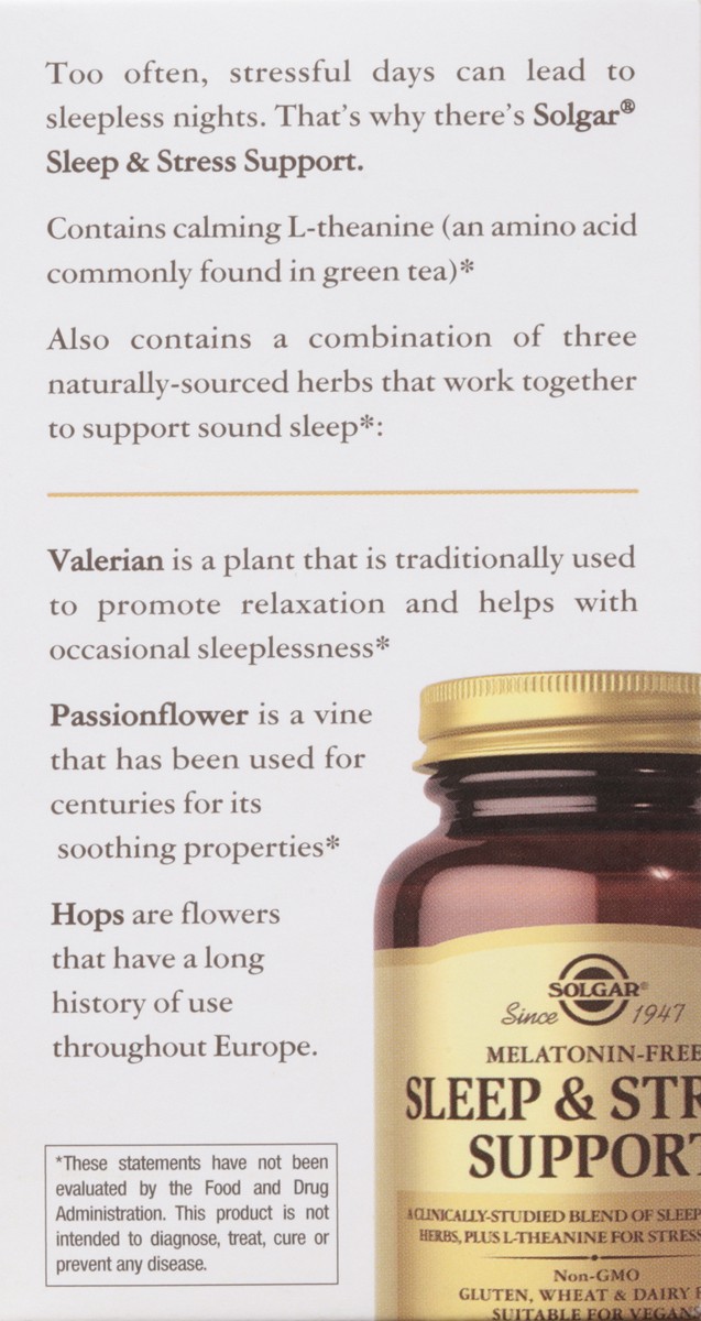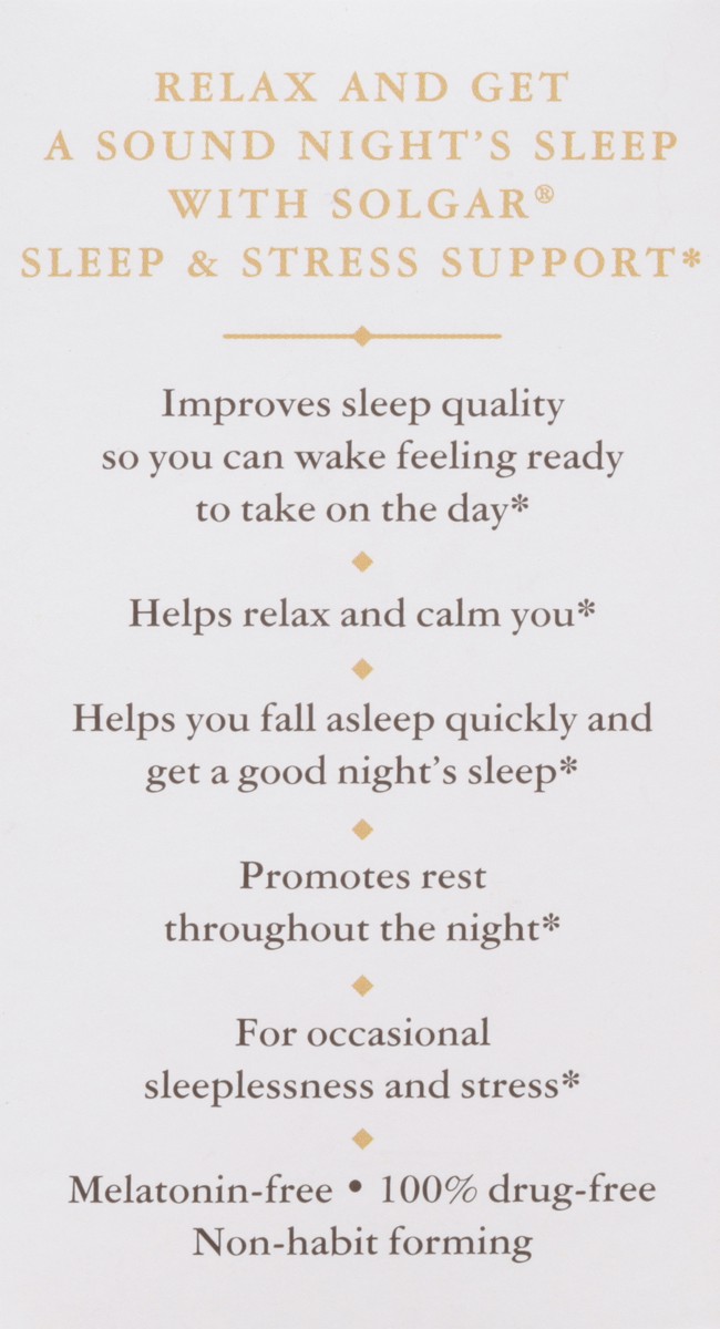 Since 1947.Too often, stressful days can lead to sleepless nights. That's why there's Solgar Sleep & Stress Support. Contains calming L-theanine (an amino acid commonly found in green tea). Also conta…