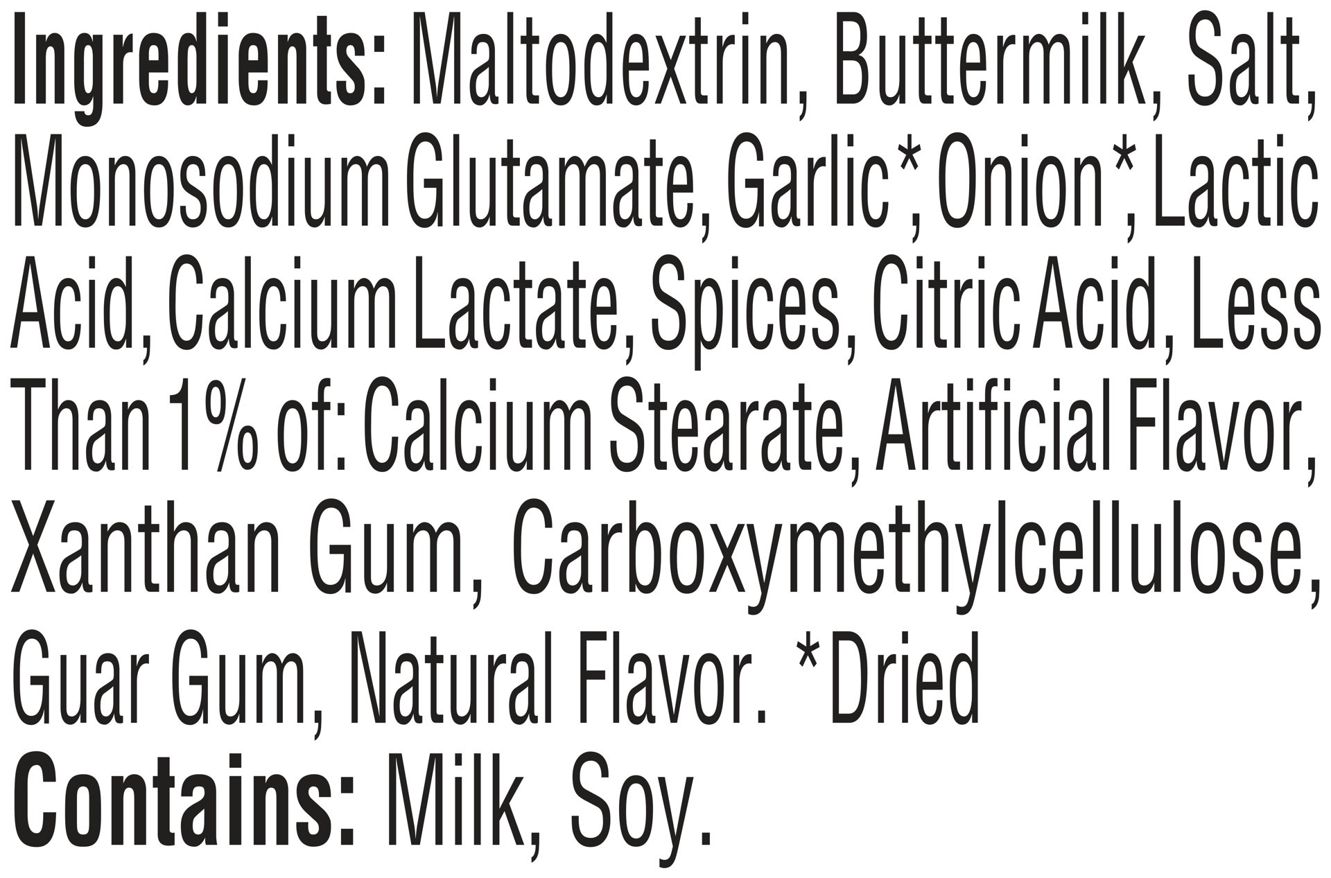 Maltodextrin, Buttermilk, Salt, Monosodium Glutamate, Garlic (2), Onion (2), Lactic Acid, Calcium Lactate, Spices, Citric Acid, Less Than 1% of: Calcium Stearate, Artificial Flavor, Xanthan Gum, Carbo…
