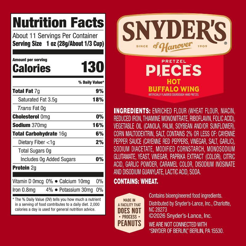 - Includes one (1) 11.25-ounce bag of Snyder's of Hanover Hot Buffalo Wing Flavored Pretzel Pieces