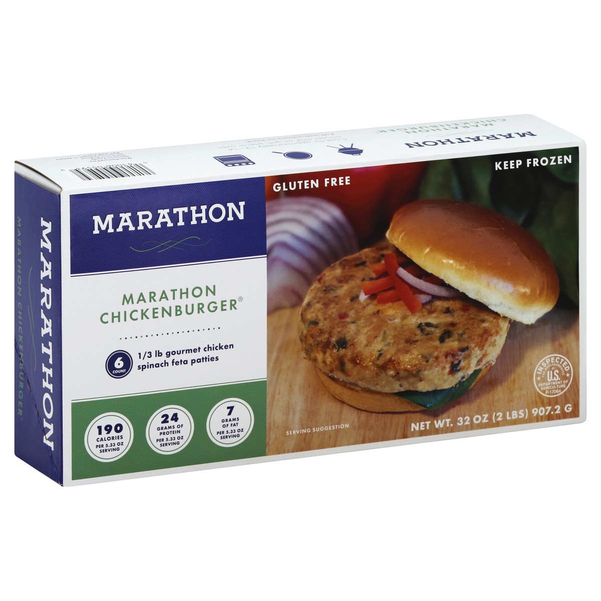1/3 lb gourmet chicken spinach feta patties. 190 calories per 5.33 oz serving. 24 grams of protein per 5.33 oz serving. 7 grams of fat per 5.33 oz serving. Gluten free. Inspected for wholesomeness by …