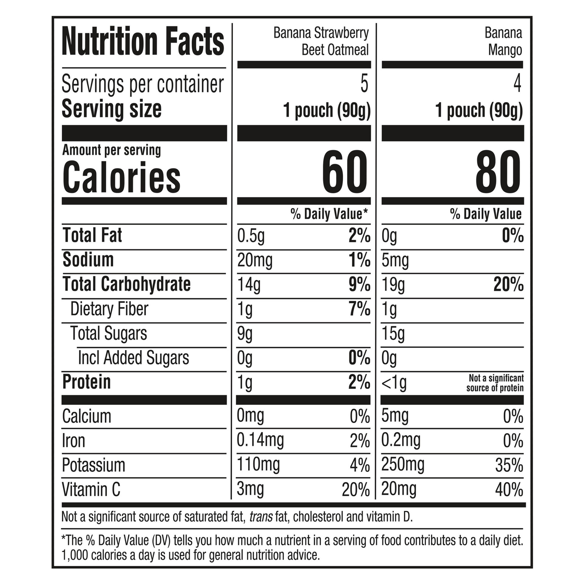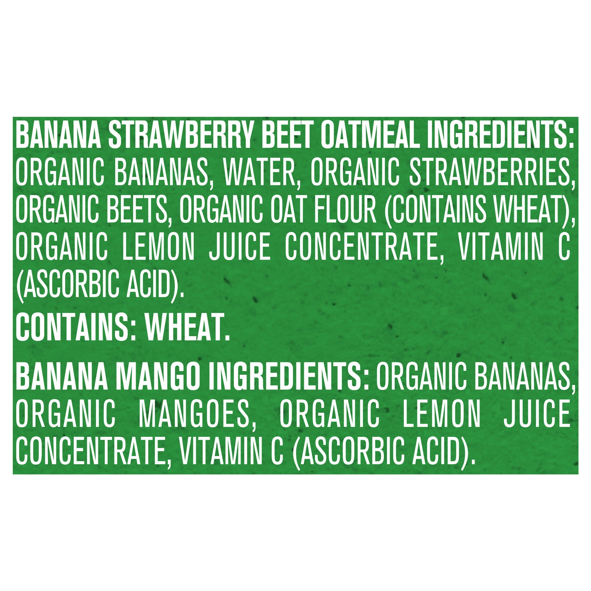 INGREDIENTS: ORGANIC BANANAS, ORGANIC MANGOES, ORGANIC LEMON JUICE CONCENTRATE, VITAMIN C (ASCORBIC ACID).INGREDIENTS: ORGANIC BANANAS, WATER, ORGANIC STRAWBERRIES, ORGANIC BEETS, ORGANIC OAT FLOUR (C…