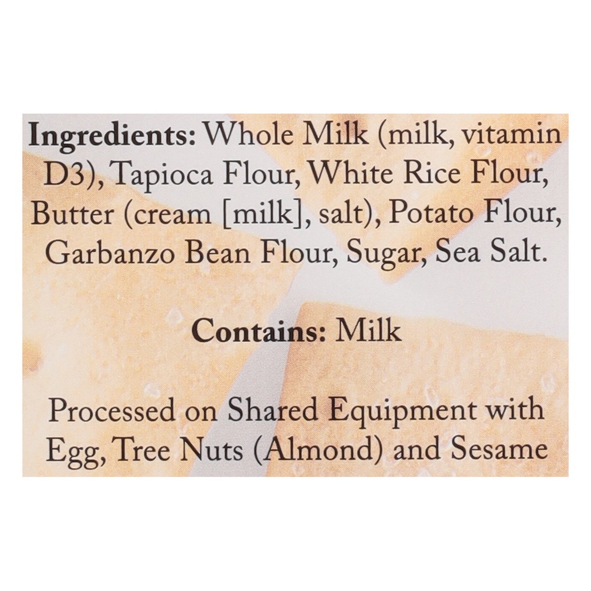 Whole Milk (Milk, Vitamin D3), Tapioca Flour, White Rice Flour, Butter (Cream [Milk], Salt), Potato Flour, Garbanzo Bean Flour, Sugar, Sea Salt.