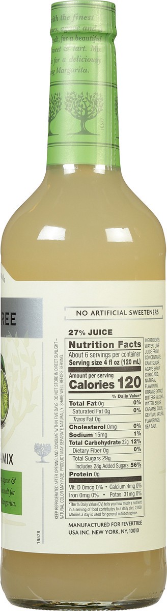 Water, Lime Juice from Concentrate, Cane Sugar, Agave Syrup, Citric Acid, Natural Flavoring, Orange Extract, Bitters (Alcohol, Water, Sugar, Caramel Color, Gentian, Natural Flavorings), Sea Salt.