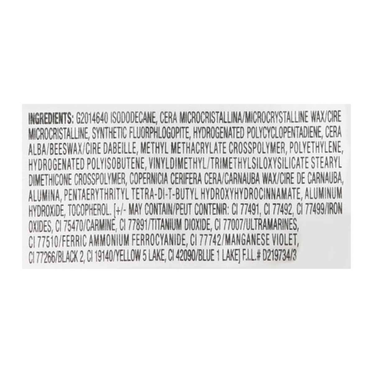 Isododecane\, Cera Microcristallina/Microcrystalline Wax\, Synethetic Fluorphlogopite\, Hydrogenated Polycyclopentadiene\, Cera Alba/Beeswax\, Methyl Methacrylate Crosspolymer\, Polyethylene\, Hydroge…
