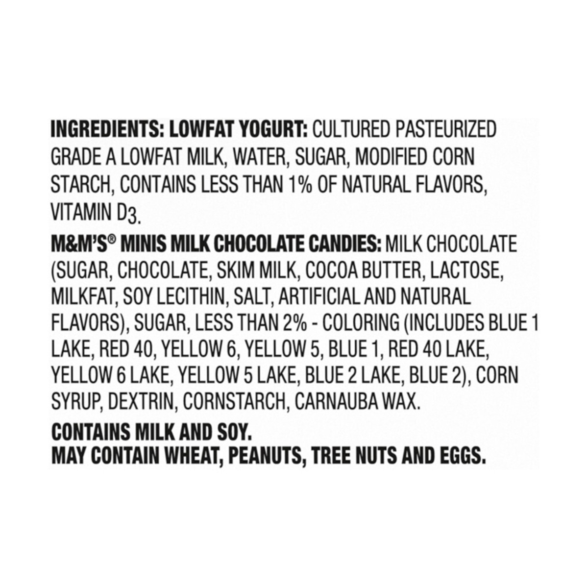 Lowfat Yogurt: Cultured Pasteurized Grade A Lowfat Milk, Water, Sugar, Modified Corn Starch, Contains Less than 1% of Natural Flavors, Vitamin D3. M&M's Minis Milk Chocolate Candies: Milk Chocolate (S…