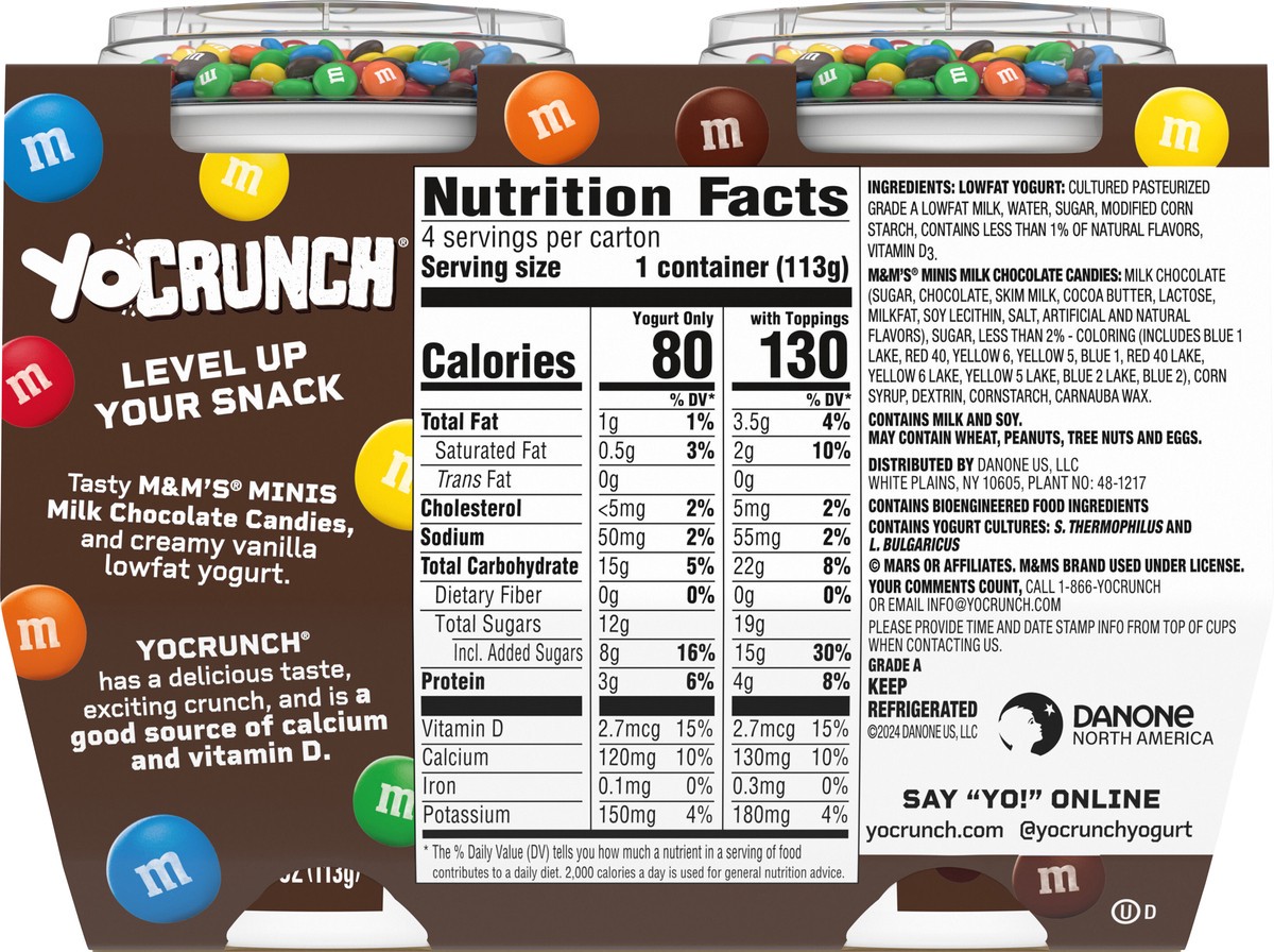 Add some crunch with a 4-pack of YoCrunch(R) Vanilla Lowfat Yogurt with Mini M&Ms(R).* This vanilla yogurt is deliciously smooth and creamy. Best of all, it comes with Mini M&Ms(R) as a topping so you…