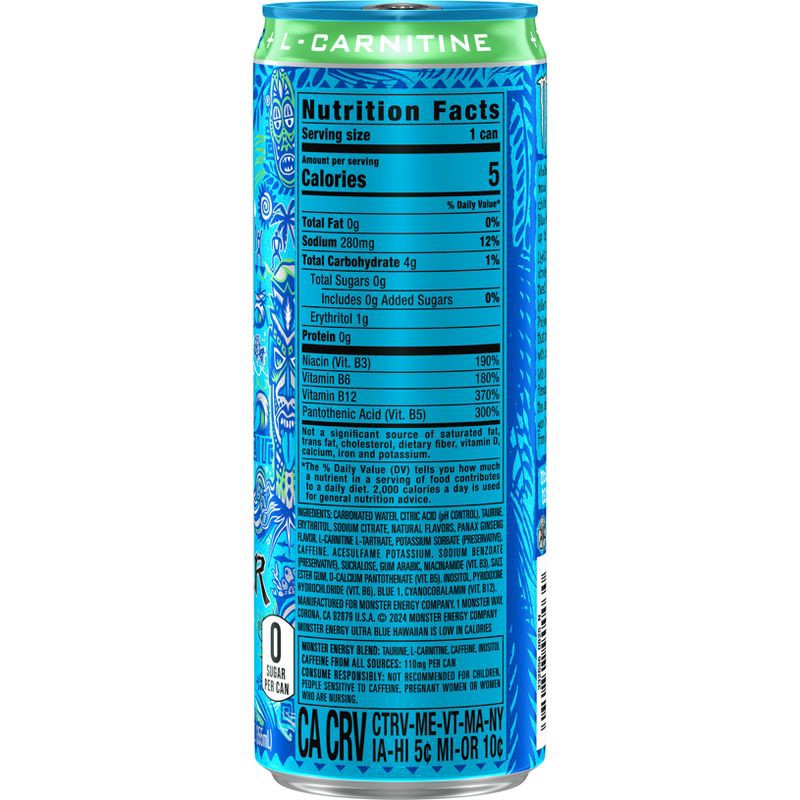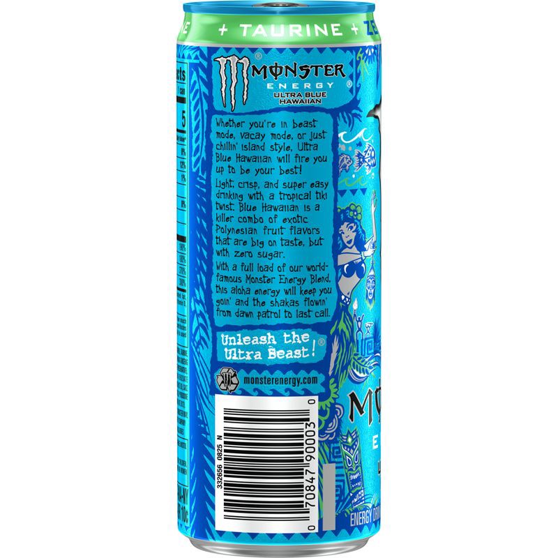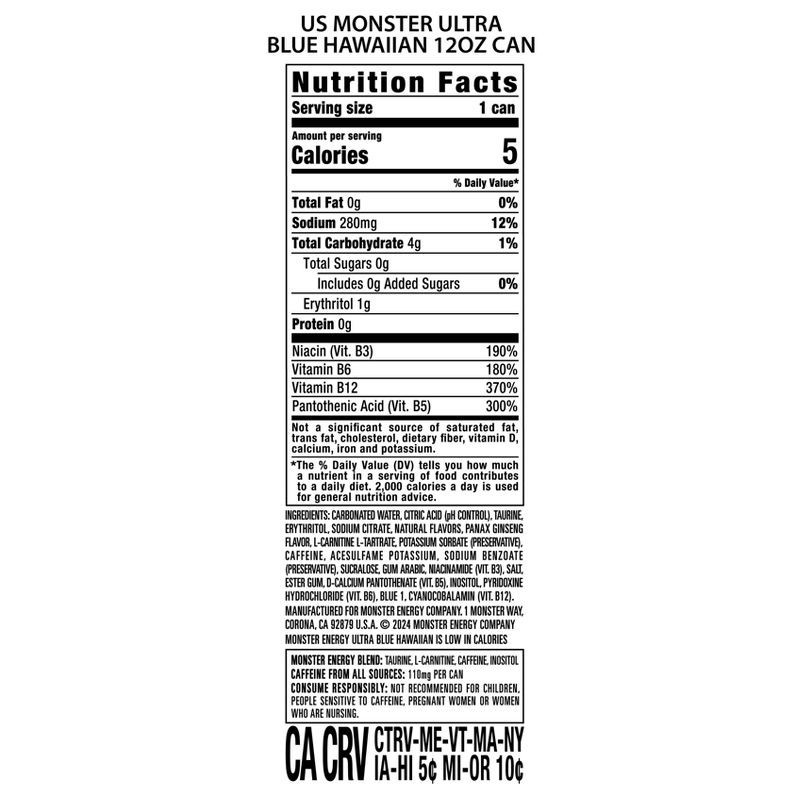 FULL FLAVOR, ZERO SUGAR ENERGY DRINK: Monster Energy Ultra Blue Hawaiian Energy Drink has 10 calories and zero sugar but delivers all the flavor you're accustomed to, packed with our Monster Energy bl…