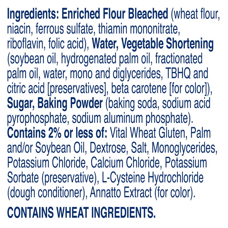 Enriched Flour Bleached (Wheat Flour, Niacin, Ferrous Sulfate, Thiamin Mononitrate, Riboflavin, Folic Acid), Water, Vegetable Shortening (Soybean Oil, Hydrogenated Palm Oil, Fractionated Palm Oil, Wat…